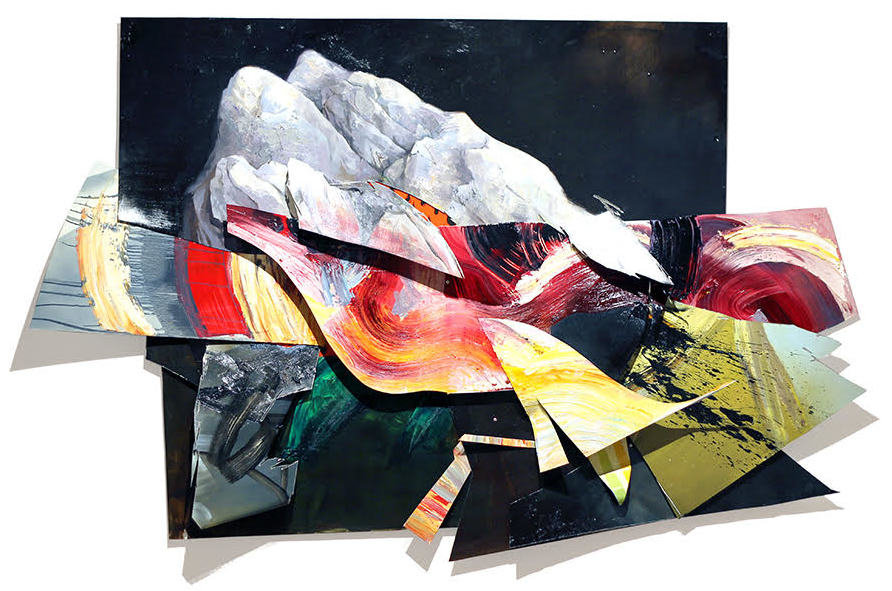 The unmistakable key to this series are the hidden black “rain drops” that intermittently peak out from beneath tortured layers of aluminum. In Fault Line they fall on an orange background and are given even more prominence in the exhibition’s namesake, Peak Velocity. In 2014, Phil Irish found himself at the Banff Centre, completing an Artist residency amongst Alberta’s rugged Rocky Mountains. To the auteur, this series reflects “a need for transformation, mountain peaks meet explosive patterns of colour that reflect our hunger for speed and fossil fuelled dynamism.”