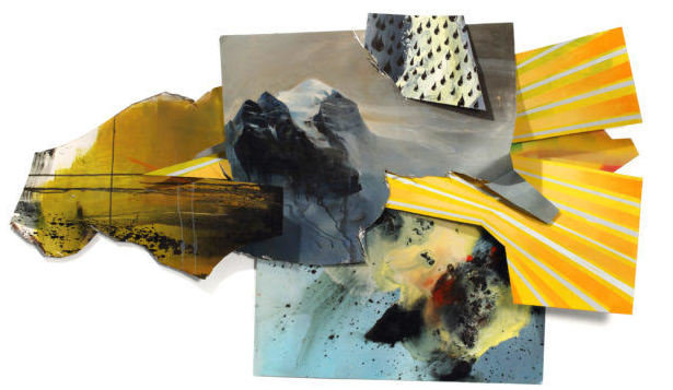 Here, the traditional rectangular painting plane has been wrenched in half. The calm of the upper register belies a painterly grey mountain rising in the distance quieted by a monochromatic black background, which is eagerly disrupted as the work erupts with fire and brimstone. The artist captures the ferocity of nature as he slices the picture plane and allows the jagged edge of the aluminum to capture the harsh reality of a fault line, characteristically ushering a forth a torrent of the earth’s innards. The hot shades of red, one has to assume represent virile magma, invade the viewer’s field of vision. What unites the composition against nihilist oblivion are the waves of soft yellow light that emanate from the chaos, we become aware that black splattering of paint marks, but not corrupts the optimism of Irish’s Fault Line.