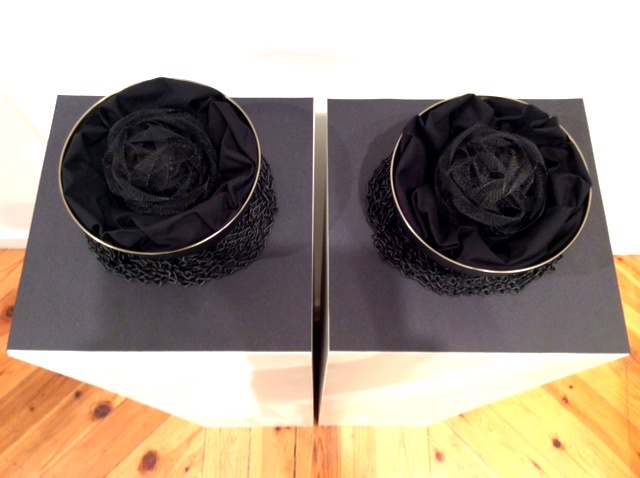 Bowl of Cherries? #1 & #2, cotton, anodized aluminum, glass, stainless steel, 14 x 23 x 23 cm each