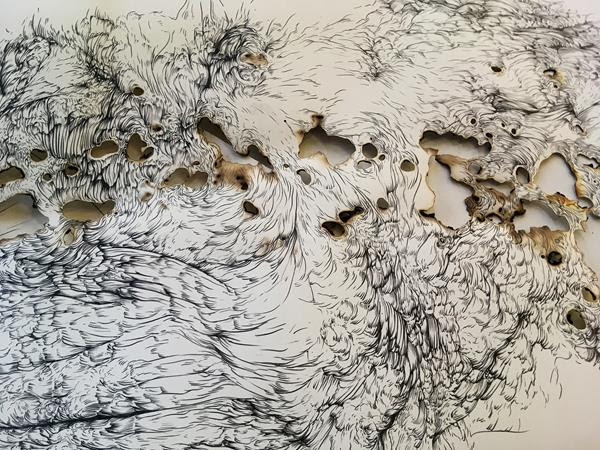 The largest wall of the gallery is covered with Arboreal Gothic by Hladík, a rather organic composition created from many pieces of beautiful drawings. Magic is hidden in the sensitive curving lines, the magic of trees, animals and even humans who might be hidden or buried in them. Some old Celtic legends tell stories of wild men living in trees, being put into a young tree that slowly surrounded them still alive. Some of the curving lines remind us of hairy heads of all kind of creatures who look at us through the burned wholes of paper. A white night heavy with mystical air and a distant smoke of bonfire.