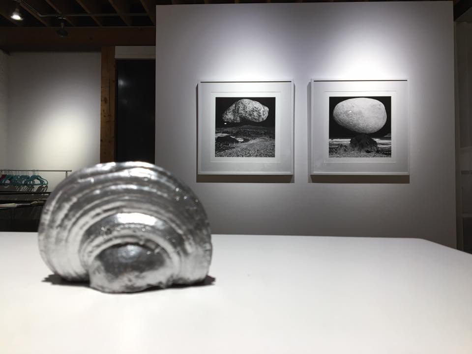 Installation view with Gonzalo Bénard, Stoned Landscapes, 2017, Photography on 240grs cotton smooth matte archival paper, 19″7 x 19″7 (on the wall) and Lumír Hladík’s sculpture (in front)