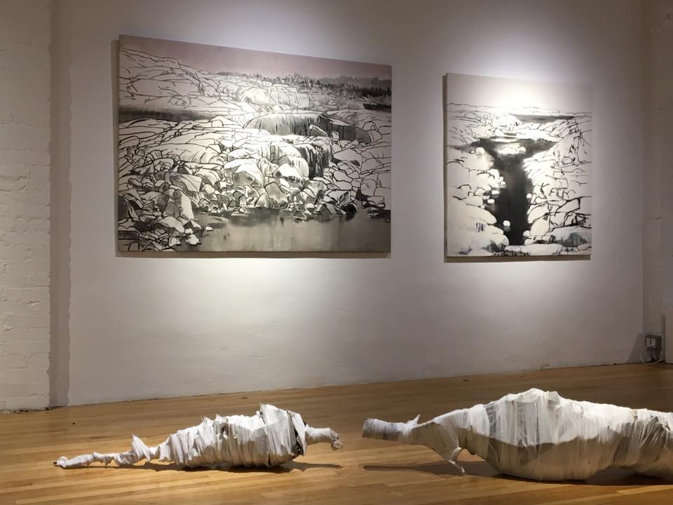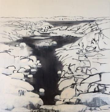 The three artists’ works are really different but they also compliment each other in their unique dramatic appearance and poetic underlining. Two of the walls are covered with Harris’ winter landscapes. Large compositions depicting ice and snow dunes with water running between them or their white shields interrupted by dark grey mud, some even with the ice turning into that much-hated black ice. These landscapes are out there somewhere in undisturbed nature absent any human present, just winter, ice, cold water that looks dark grey in the absence of sunshine and a far off forest with leafless trees. They create a very cold feeling but still somewhat peaceful.