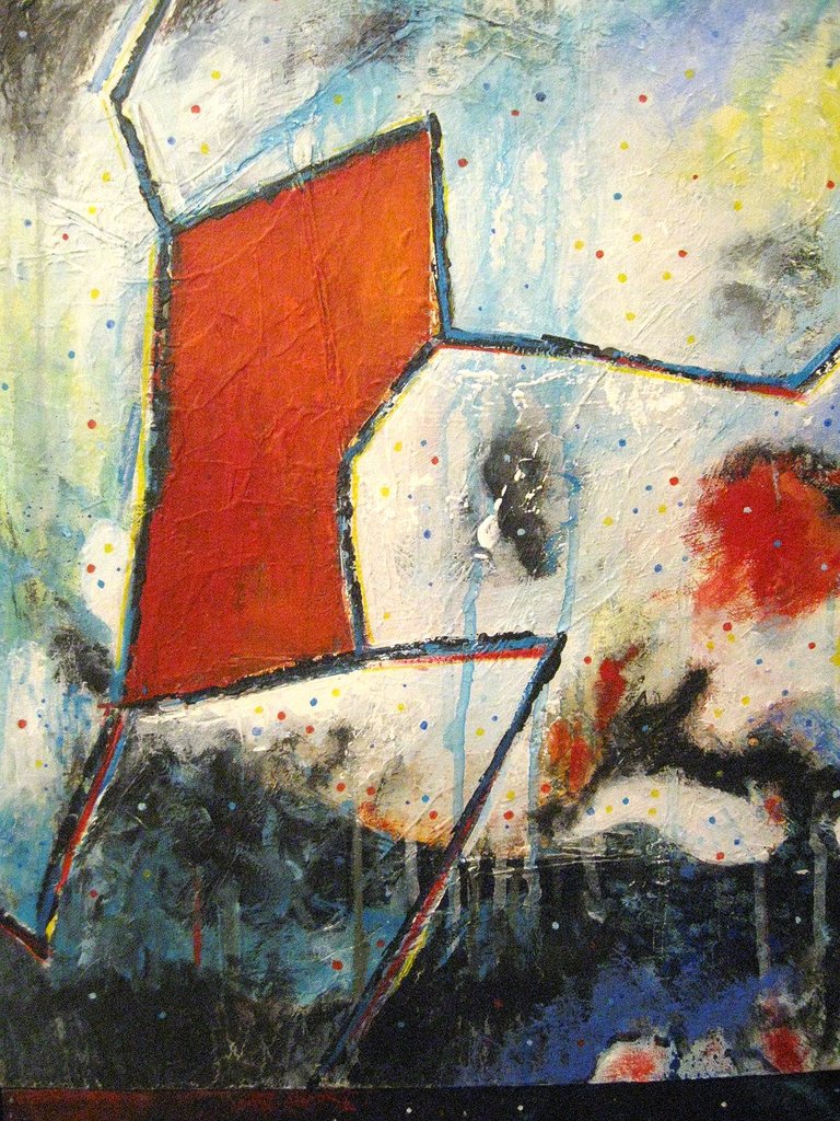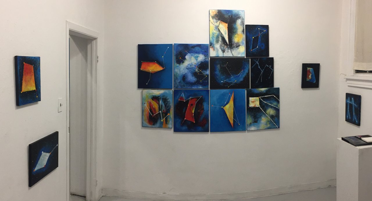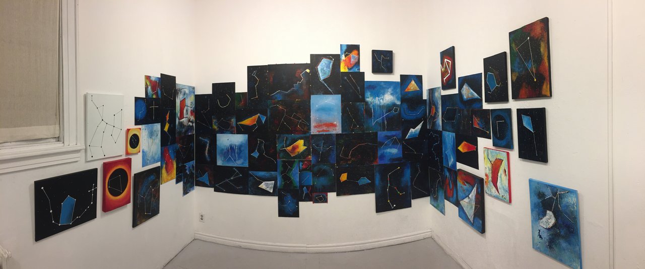 Utilizing a salon style hanging arrangement, dozens of colourful acrylic paintings in an assortment of sizes evoke the impression of a celestial star map wrapped around the gallery walls. Panels range in dimension and material, some painted flat on canvas while others protrude on wood block. The high-saturated primary colours painted and splattered on the dark atmospheric backgrounds create vibrant bursts against the ominous depth of infinite space.