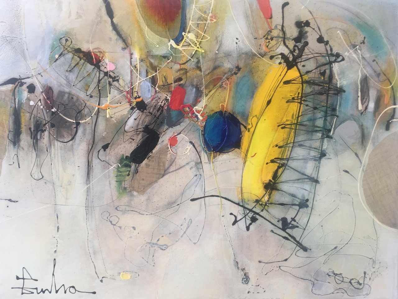 The Toronto based Korean artist Eunha Kim has left her original country at a very young age. She lived on her own as an international student since high school. She said that the time she spent studying in London was very lonely and she was very homesick. One day, when she visited a farm on her trip back in Korea, she watched the traditional dancing ceremony called Nong-Ak, a form of folk dance, a rural ritual, which often performed by the farmers to celebrate their harvest after a year-long of hard work. She was instantly touched by the raw energy of the dancers. The movements, music, and customs have greatly inspired her. The accidental discovery of Nong-Ak brought her happiness, and it reminded her that life can be enjoyable. Upon returning to London, she started recreating these moments of joy in her artwork. She dripped paint freely on canvas in order to mirror the motions of dance; the head spans in particular. She used Korean traditional colors to portray the sound of music and motions. Her works are expressive and full of energy.