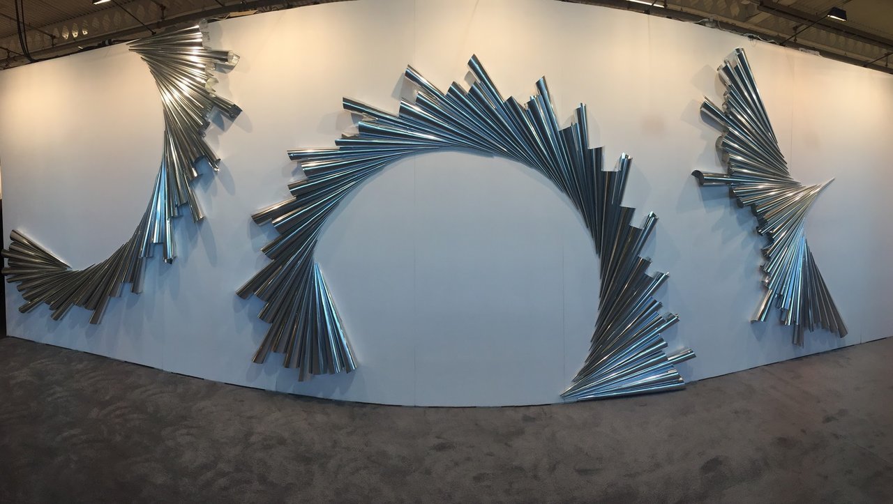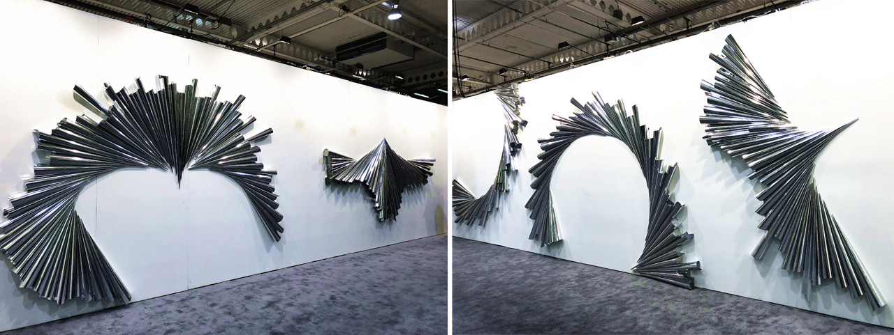 Upon entering the exhibition, the work Shine On by Nathalie Sanche greets the visitors. A series of silver, rolled foils assembled as decorative, geometric designs welcome the visitors with their luminous and captivating image into the space and guides them past the initial reception.
