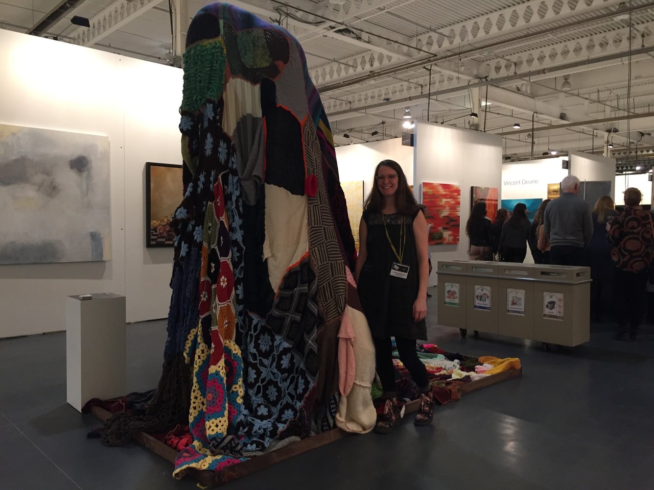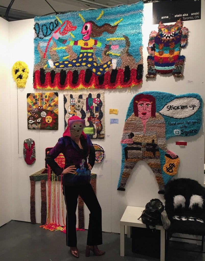 As a part of the Untapped section of the fair, Anna Stein aka anski stands out with her wall-based rug works. Originally from Nova Scotia, the artist appropriated the tradition, folk medium of rug-hooking to embrace the post-internet age and render cartoons, memes and similar punk aesthetics in the otherwise, regularly conservative medium.