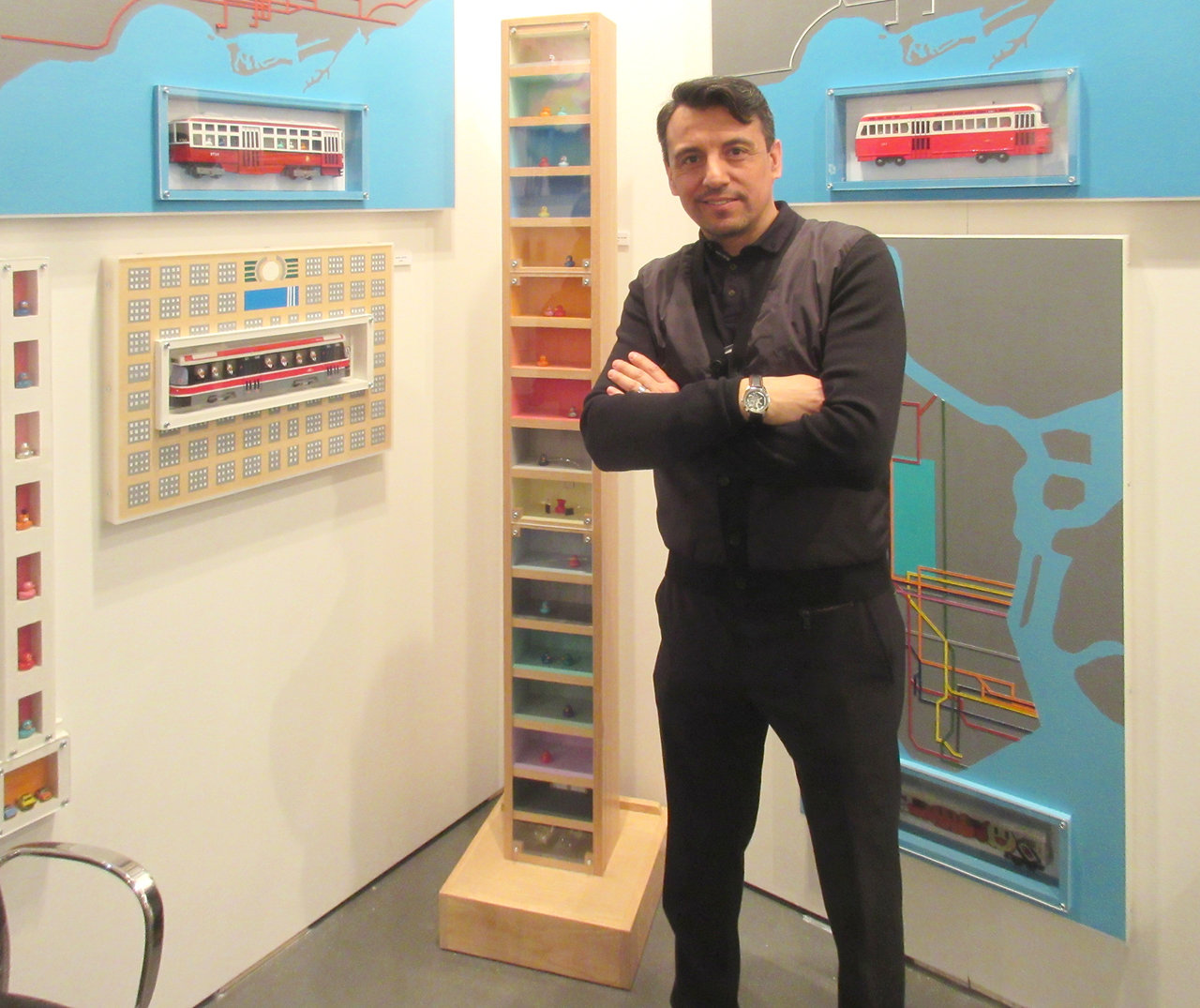 The playful wood constructions of Antonio Caballero caught my eye. Originally from Chile, Caballero has been a resident of Canada for about eleven years. Precise, colourful, and orderly might describe these well-crafted sculptural works, not to mention, fun. Their inspiration grew out of a desire to see how people lived, travelled, and moved. Ergo the artist’s fascination with streetcars and TTC routes. His narrow, totemic condo tower with windowed units reminded me of old CD storage shelves.