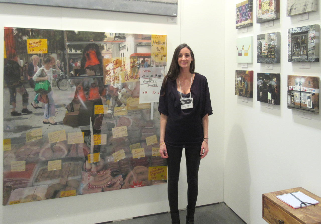 At first glance the paintings of Catherine McMillan appeared to have a photography base. Although McMillan uses the camera as inspiration, her works are entirely painted with airbrush and meticulously-cut stencils. The artist is from the Toronto area, but has been based in Seattle for the past year, as a result of her husband’s work with MicroSoft. My attention was drawn to a Kensington Market scene, a subject for which she seems to have a particular fondness. McMillan’s largest work here was from a market in Berlin, a multi-layered composition densely packed with detail, remarkable in its obsessive adherence to her preferred technique. As her business card reads, Catherine McMillan has clearly earned the handle, Stencil Artist.