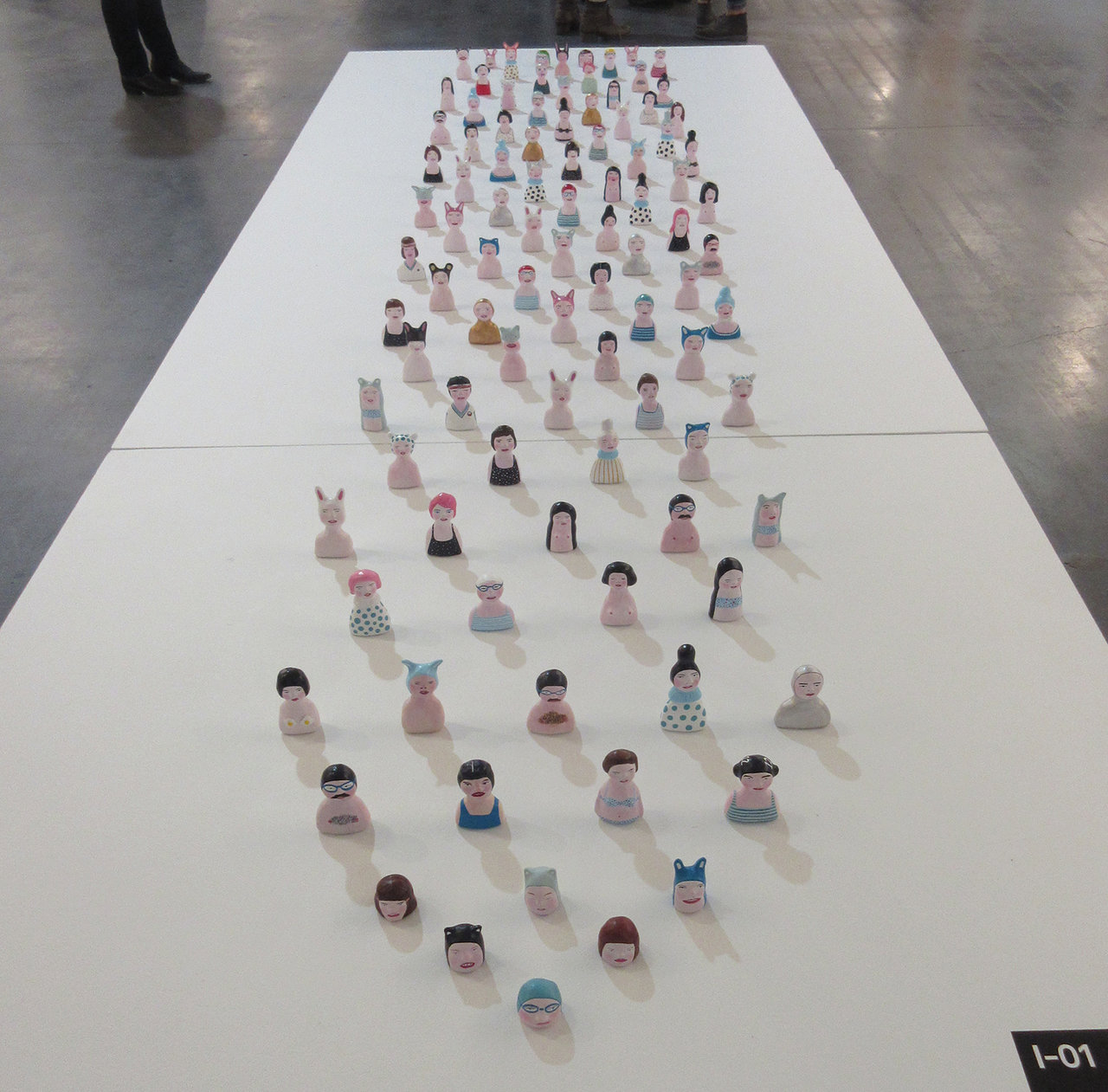 Isabella Di Sclafani’s display of 100 clay sculptures were laid out neatly in arrow formation, a bit like an army phalanx. I didn’t see the artist, but Di Sclarani’s statement indicated that she wanted people to view them as original art pieces. I saw no reason to doubt her. In her exhibition of the 100 she has fulfilled an ambition to display her large group in a large space. She admits to being fascinated by people’s response to her clay people, but hates it when they refer to them as “whimsical, quirky,” or “cute.” She contends that these characterizations, as she says, “trivialize and diminish the power of my art.” Sadly, the purview of the artist doesn’t extend beyond the work itself. As a viewer I’m powerless to stifle my own responses. Regarding Di Sclafini’s figures, I wouldn’t say “cute” necessarily, but could say that they were not entirely without charm.
