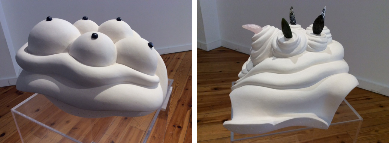 There is magical reality in this show as well, sculptures that challenge our perception. Dina Torran’s work at first sight reminded me of a BBQ, then a quash-like plant with unusually large seeds. When I finally read the title, Time Capsule, I was surprised, but not that much. What is a time capsule and what it contains? The most important things we want to survive us and our times. Torran likes to use natural elements as a base and write them over with her personal history – so I think this sculpture can depict many different things at the same time. The receiver would be pleased with the beautiful black marble. Fred Hummel’s pieces lead us farther away from reality into a clearly magical world. Just as the objects we know from real life go through a metamorphosis the white stone also loses its solid quality and becomes light as whipped crème on a cake. Catharsis reminds us of a birthday cake with candles on the top. However those spikes are arrow heads, sharp and able to hurt. In Anticipation expectancy creates multiply breasts presented here in a truly strange way.