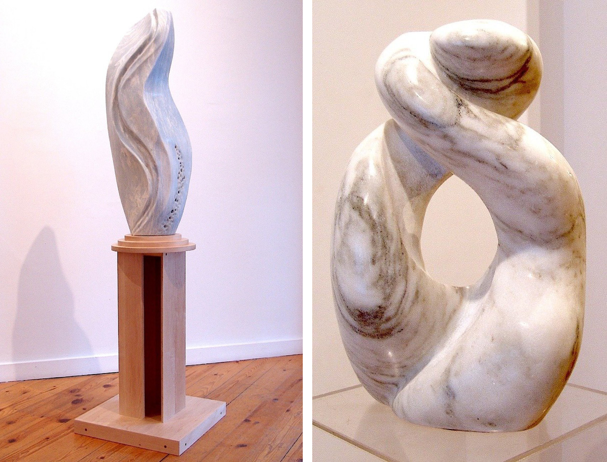Angela Verlaeckt-Clark, Stone Clouds, omega blue marble, maple (left) & Mary Ellen Farrow, Essence, marble (right)