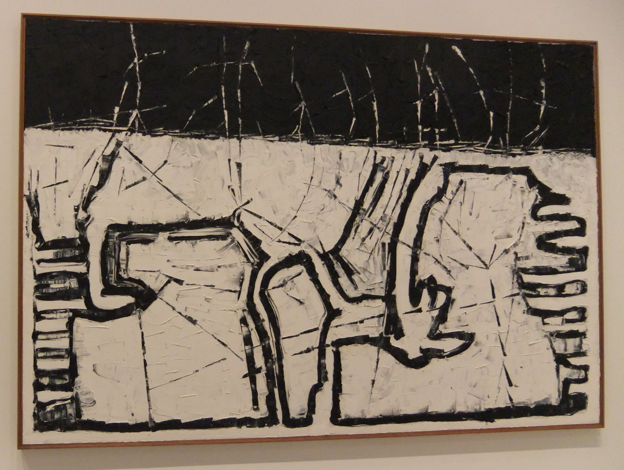 The tension between the couple grew and Riopelle called Mitchell “Rosa Malheur” – Rosa Unhappiness. He started to spend more and more time in Canada. Mitchell painted Chasse interdite (Hunting is forbidden) (1973) to let Riopelle know that she doesn’t approve of his hunting trips because it takes him away from her and she misses him. Riopelle embraced Quebec’s vast landscapes with its wildlife, fishing and hunting, depicting First Nations cultures that resonated with him. The title of the painting Micmac (1975) or Mi’kmaq comes from the Indigenous peoples in the Gaspé Peninsula, but in French the word means confusion or disorder. It is a very intriguing work. As the story goes, the artist painted one of the panels then transferred it into a blank canvas. Then he extensively reworked both until they seemed to be different. The left panel has a shining dark area at the top contrasted with a matt white on the right. Darker, warmer colors on the left seemingly oppose the lighter, colder palette of the right. Both panels have hidden crosses (a reminder of Riopelle’s struggle with the Catholic religion) and the elements of the paintings are organized around them. Chaos rules the surfaces with a little bit hope in white light of nothingness at the bottom of the right panel.