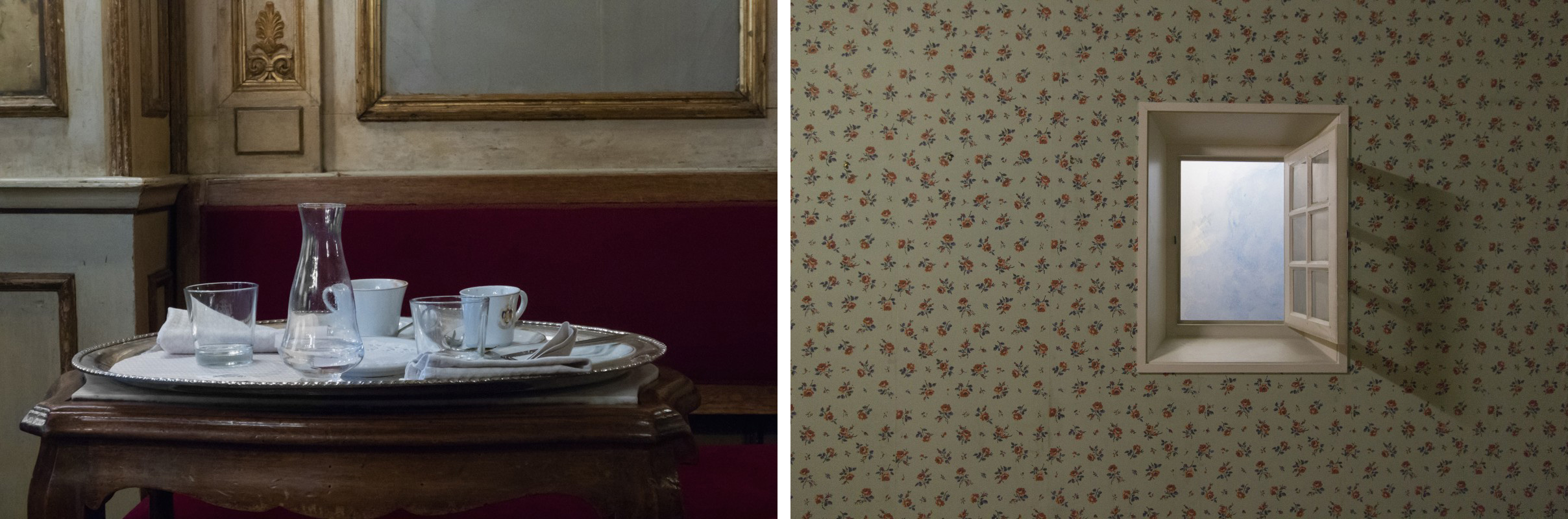 Angela Grauerholz, Venice Cafe (left) and Musée Carnavalet – Salle n°106 Chambre du temple (Paris) (right), each Inkjet print on Arches paper, edition of 5, 48″ x 68″