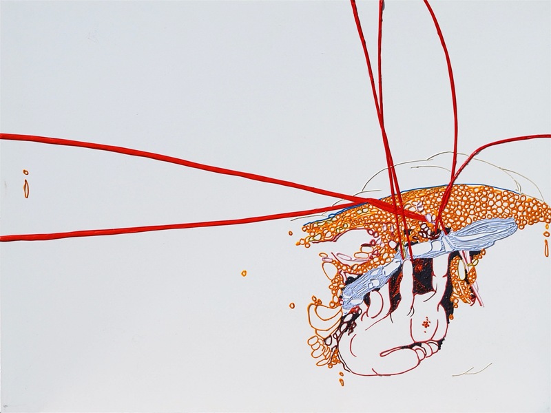 The inspiration for her latest series, Examples of Suture, came from the least expected place: the kitchen of a restaurant. She was watching the cook butchering a fish, the head, the opened belly, the organs coming out – with fascination. She watched the same happen with a chicken and then, wanting to see more, she approached some butchers and asked to observe them at work. After a while she became even more intrigued and attempted to partake in classes where they were dissecting cadavers – human cadavers. They have very strict privacy issues, so she never attended any of those classes but instead she turned to anatomy books with detailed images of organs.