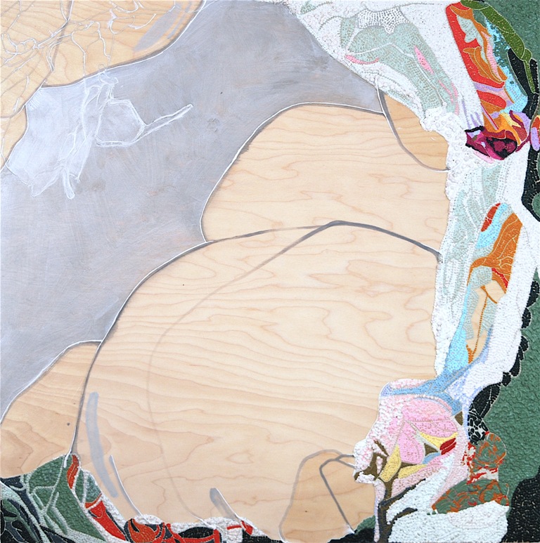 Strained #13 is mostly an blank wood panel, a negative shape, that, with a few lines, has been turned into the big body of a Buddha, a sumo wrestler or a very pregnant woman. The body is surrounded by very fine layers of textured paint that look like embroidery with small little stitches and dots, reaching out into the third dimension of the space.