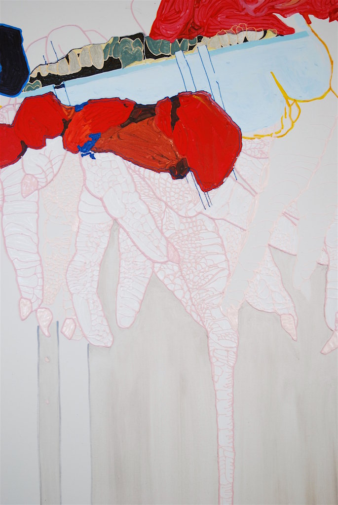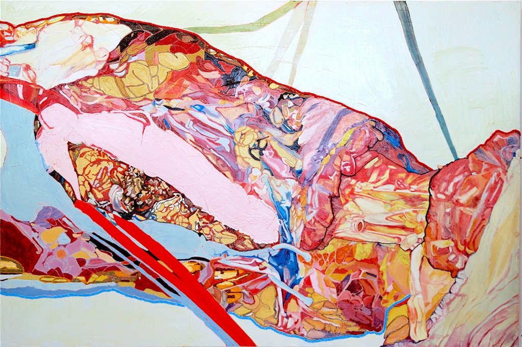 Suture #1 is an extremely complicated and rich painting. The surface of the canvas is almost filled – an unusual compositional approach from Kim. There is hardly any empty space around the image but to balance negative and positive areas, there is a white shape in the middle, a closed emptiness. The outline of the animal reminds me of a large fish, butchered and bloody. However, it is not scary or disgusting. Rather the opposite – it is almost beautiful. The way Kim has painted the details of its inside are more appealing than repulsive. The viewer can’t get enough of the hundreds of tiny details and formations – even if they represent air sacks, organs, intestines or fatty tissues. Looking at this large painting you don’t even think about what certain forms are, you just lose yourself in its components. As Kim stated, “Through disassembling, abstracting, and suturing, human and nonhuman flesh and viscera unhinge from their source images and become collages of fused corporeal textures.” The colors are so rich and stunning, the harmony is amazing. All the hues of red, yellows, warm oranges and soft violets are there, touched up by just a little blue, but in crucial places of the composition – making the painting very vibrant.