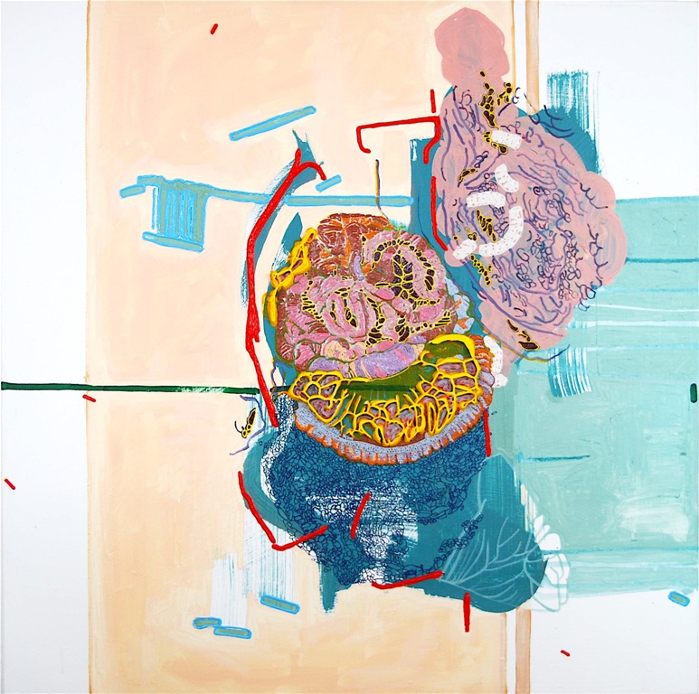 Examples of Suture is a very unusual exhibition, not just because of its strange theme but also because of Kim’s method of composition and her use of paint. Some of the original animals or body parts can still be identified but through the actual painting they lose their significance and become abstracted; mixing the real and surreal – taking us into a different world. She enhances her rather morbid imagery with delicate strokes and colors – so the ugly body parts go through a metamorphosis and become almost beautiful. Kim is a talented young artist and a colorist worth watching in the future.