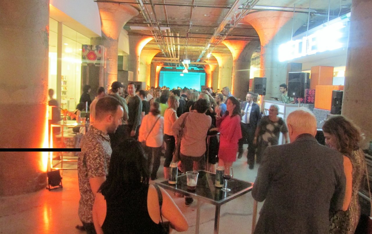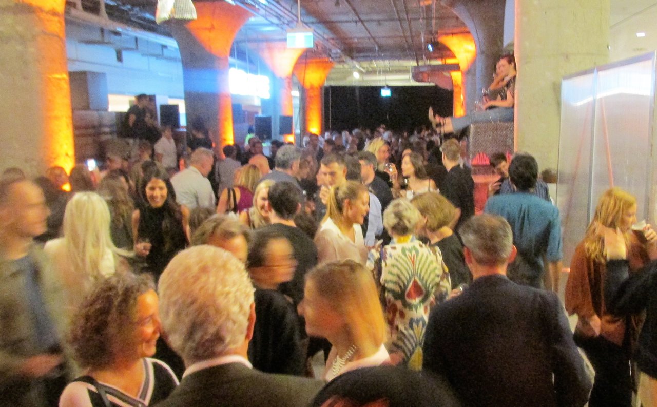 The five floors of the building dedicated to MOCA’s new home were filled with curious visitors. The main floor was packed for the reception as people chatted and visited the bar. The large circular support columns of the building, which go up the ten floors of the structure, were embraced and helped remind us of the building’s history as an automotive industrial property. The new elevators whisked people up the other 5 floors of the MOCA – a great expansion from its Queen Street location.