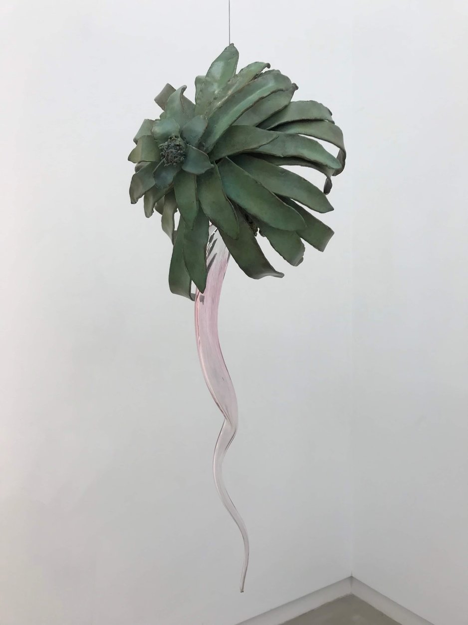 Lorna Bauer has a suspended sculpture titled Bromeliad (Margaret Mee), in the corner of the gallery. The piece is a representation of a plant from the bromeliad family (the same as the pineapple) and features a long, spiraled root made from pink glass. A common air plant, the bromeliad is cast in bronze and glass, two dense, heavy materials which are a complete inversion from the typical lightness of the real plant. The title of the work pays homage to the late botanical artist Margaret Mee whose work had a significant role in environmentalism, particularly in the Amazon. Some members of the bromeliad family have adapted to extremely harsh climates, from rainforests to deserts and even man-made environments, such as growing on telephone poles and other structures for support.