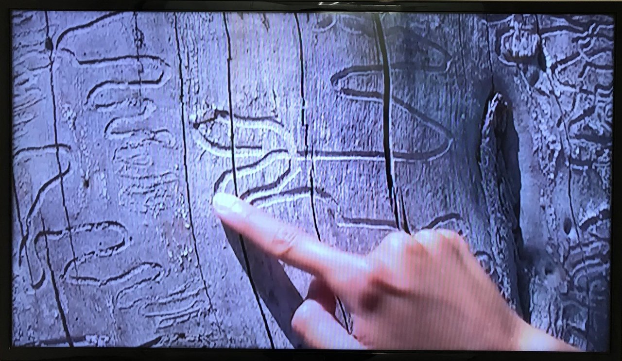 Maryanne Casasanta’s video piece Morning And Its Summer is a 7 minute 23-second long video that features a hand tracing the patterns formed by woodworms under the bark of trees. The tree trunk the artist is engaging with is presumably the same that audiences passed by in front of the gallery, an integral part of the gallery’s sidewalk garden. The work is mesmerizing and simulates the haptic, tactile senses of navigating through touch. The gesture of tracing the lines in the wood demonstrates the performative potential of using naturally generated forms as a blueprint for directing human movement.