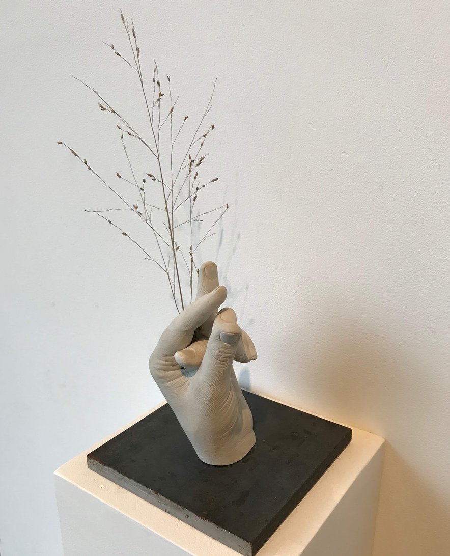 Under the vinyl sign Wild Inside, Vanessa Brown’s Ovule sits on a plinth. A plaster cast of a hand is grasping a dried sprig of an unidentified plant referred to in the exhibition catalogue as “flowers”. Ovule is the word for an immature germ cell that becomes a seed after fertilization. The hand seems mutated or interdimensional, either like it has grown new fingers or it is an image locked between two states of movement or maybe multiple hands are overlapping while grasping for the same thing. The piece could be interpreted allegorically as an imagined, post-apocalyptic mutant picking what may be some scarce plant for nutrition, or perhaps it speaks about the desperation of the current times or for how we all are so quick to pluck native weeds to maintain our unnatural and finely groomed lawns and gardens. Regardless of interpretation, it is a great beginning of the rest of the exhibition.