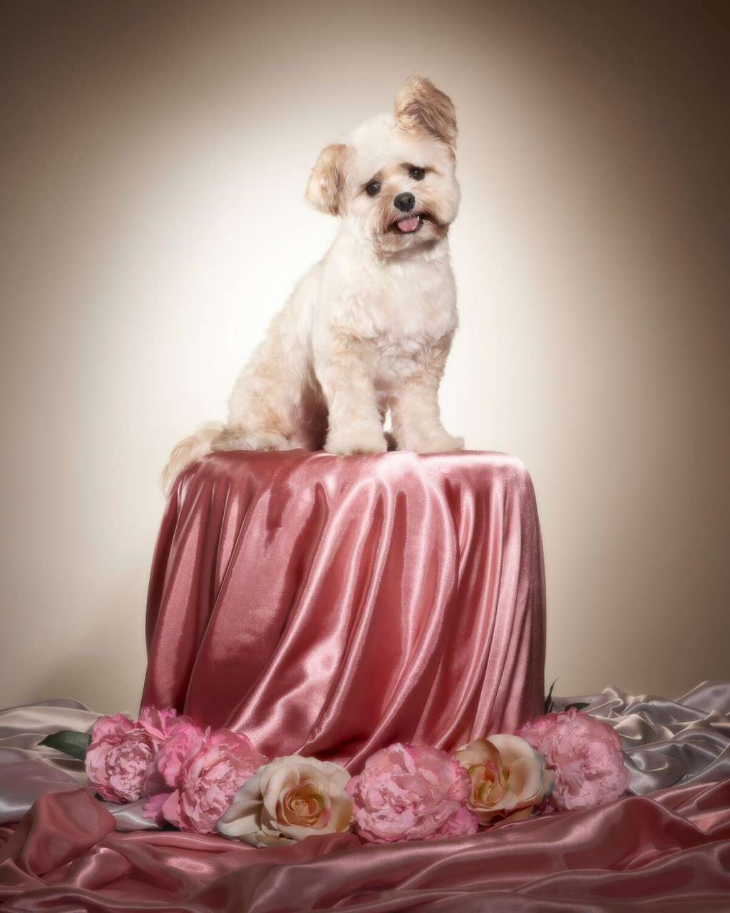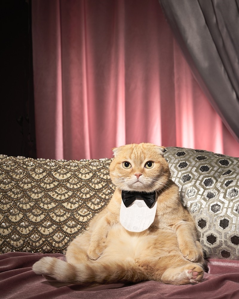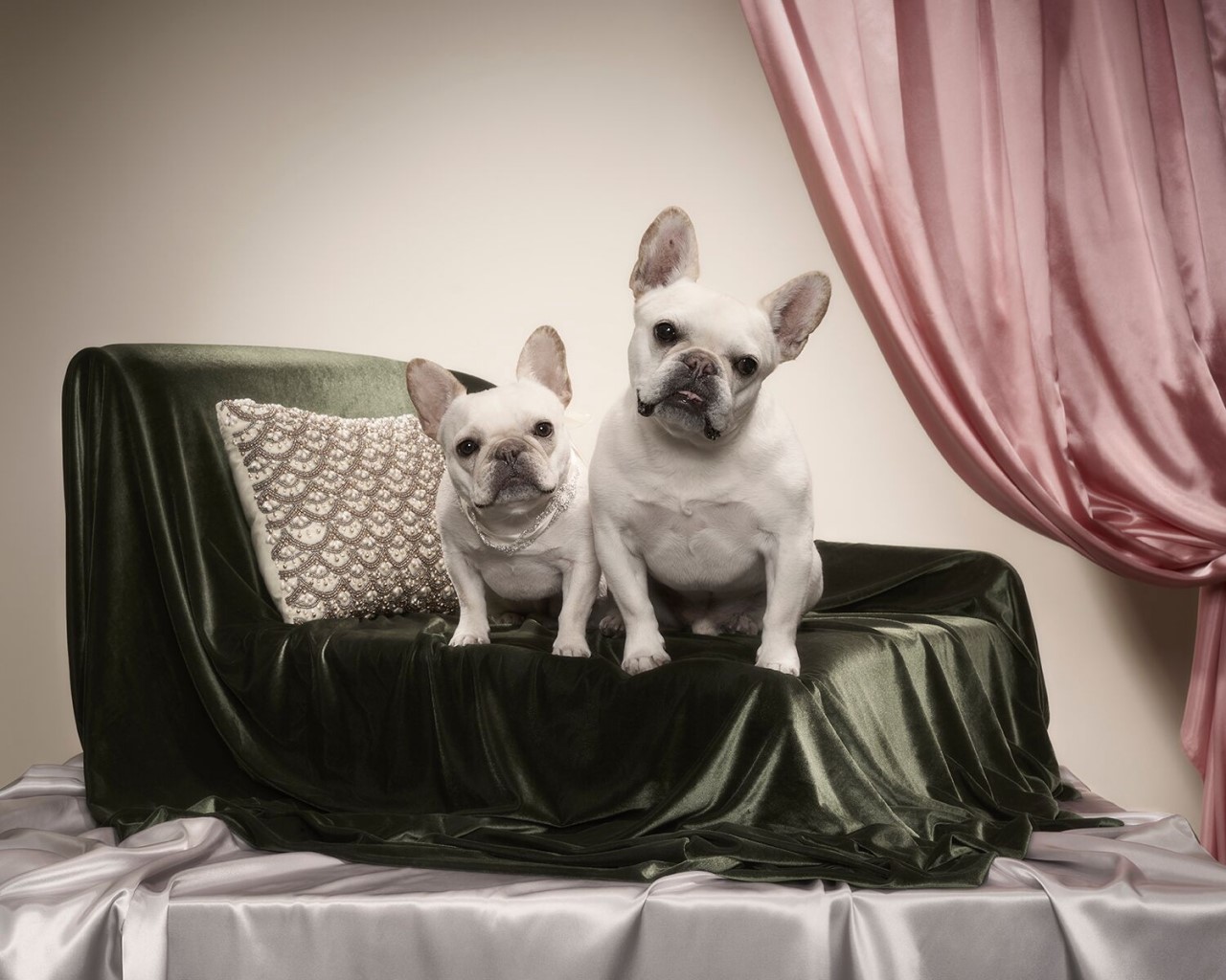 The exhibition features large scale vinyl installations on the walls, a series of pet portraits. The photos are characterized by soft focus, warm lighting, a vignette border and glamourous, thespian decor. The models for these portraits are the famous pets that the artist followed on social media, such as Popeye the Foodie Dog (366K followers), Weston and Fira the French Bulldogs (135K followers) and Shrampton the Scottish Fold Cat (52.1K followers). The images attempt to illustrate their distinguished status through the traditional photography style suited for Hollywood stars in the 1930s.