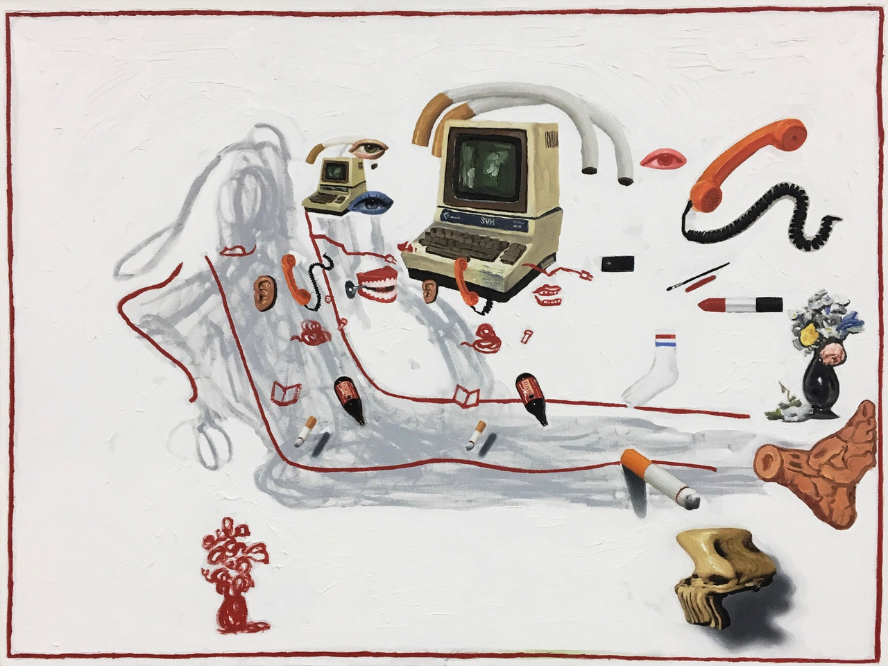A portrait, titled Progress, by Daniel Segrove, a San Francisco based artist, depicts a young man in a thinking position. In a mostly realistic representation, his mouth seems to be erased. He doesn’t want, or can’t, talk and that attitude gives the portrait an unsettling expression. Juxtaposing the meditativeness of Segrove’s painting, Emilio Villalba’s semi-abstract composition, Reclining Figure with its fragmented body parts and objects is rather chatty and loud.