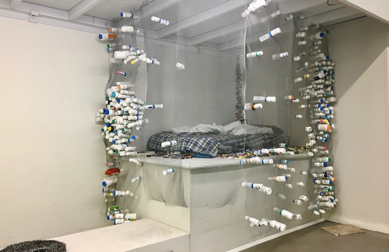 Installation view with Cage of Wonder, 2016-2019, 100″ x 110″ x 62″, plastic construction bricks, aluminum mesh, empty medication bottles on plywood and steel platform