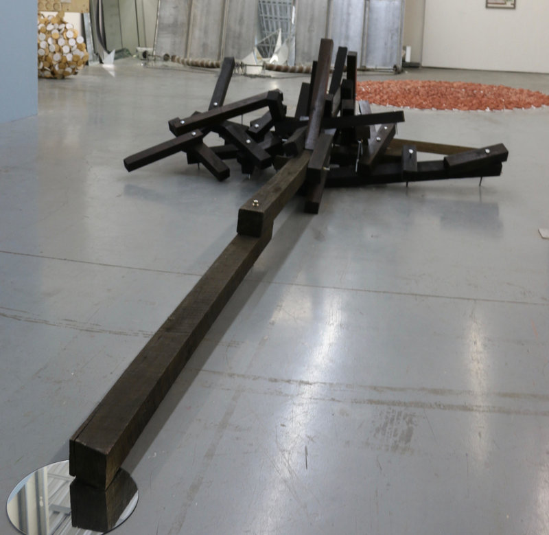 A huge wooden structure of Kananaj’s guides us deeper into the gallery’s interior. As the artist says, living in Canada for a long time he has always admired wooden cabins, and their structural perfection. They protect the home fire; they protect life in a cruel climate. He wanted to build a wood structure for a long time, but his work is not functional. Its upper part somewhat reminds us of bonfires in the way the wood blocks are crossing each other. Wooden structures sometimes can catch fire and fire is one of the elements that lead us into the Circle of clays.