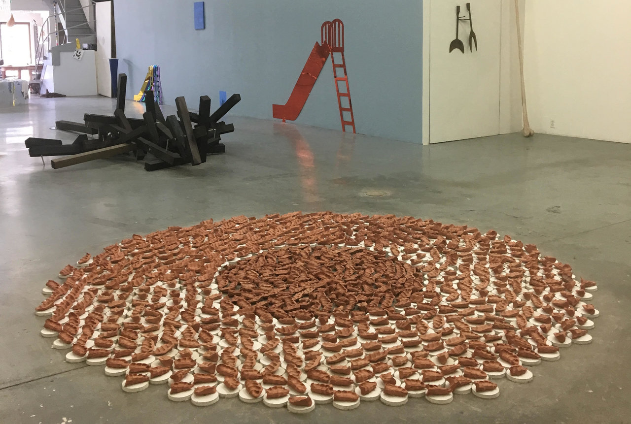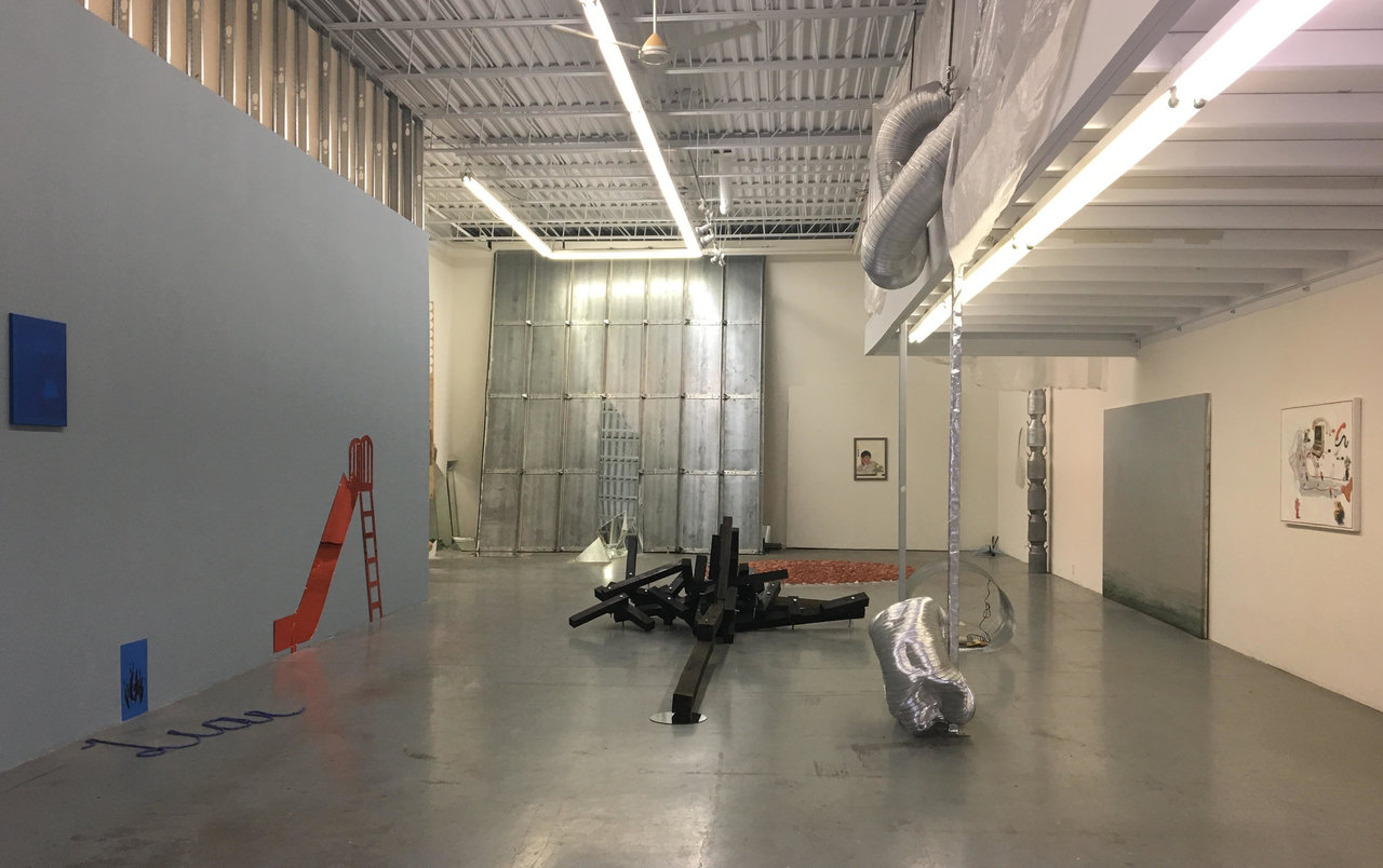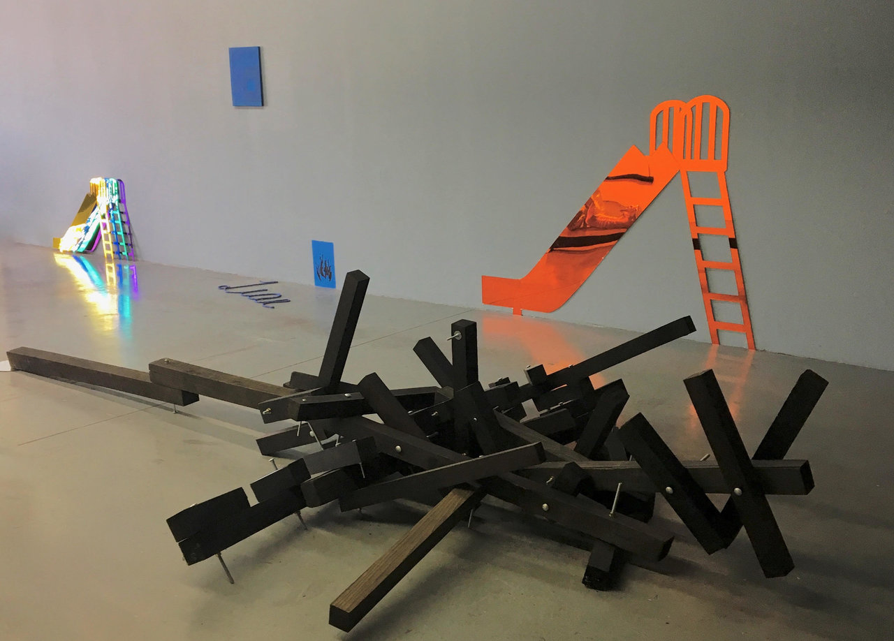 Oscar Figuera, a returning artist to the gallery, is represented by his signature slides. The slides are non functional but very colorful, reflecting the light in a playful beauty.