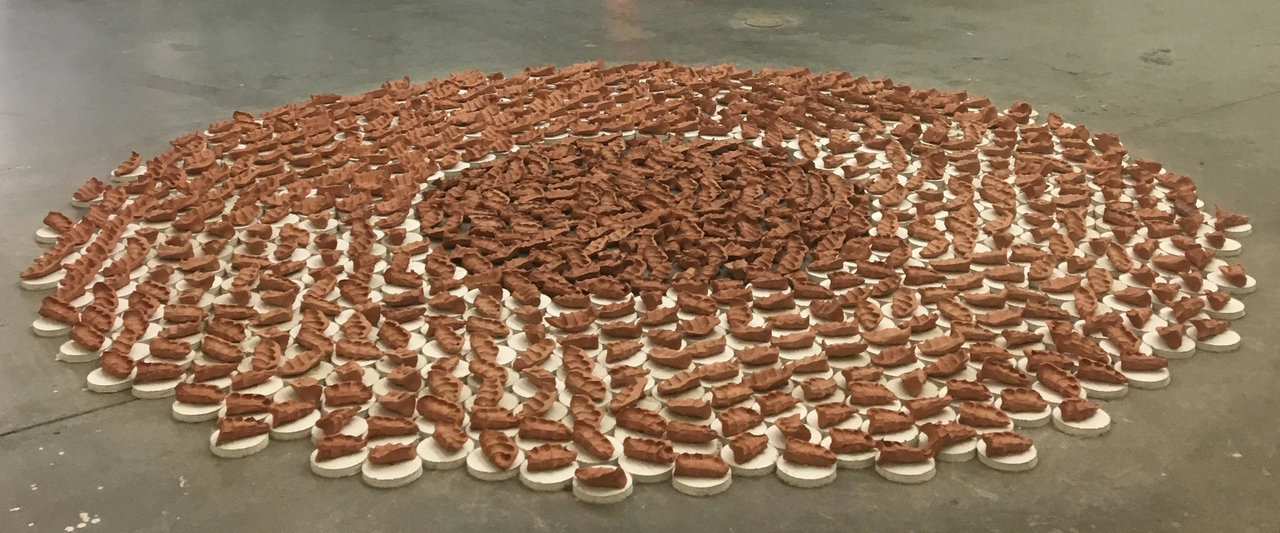 This circle is so simple that it makes it exquisite. The artist’s handprints in clay are organized into a large circle; large pieces in the outer rings joined by smaller ones closer to the centre. They are all similar, showing the artist’s fingers. The idea is old, clay has a long history and it is also one of the artistic materials that children play with. It is personal, it suits everyone. It is very physical, as Kananaj wrote, “I free my energy and clay receives it, imprinting the squeeze permanently.” He sees the experiment with clay as an embodiment of a world, a gift received, his vision as a maker.