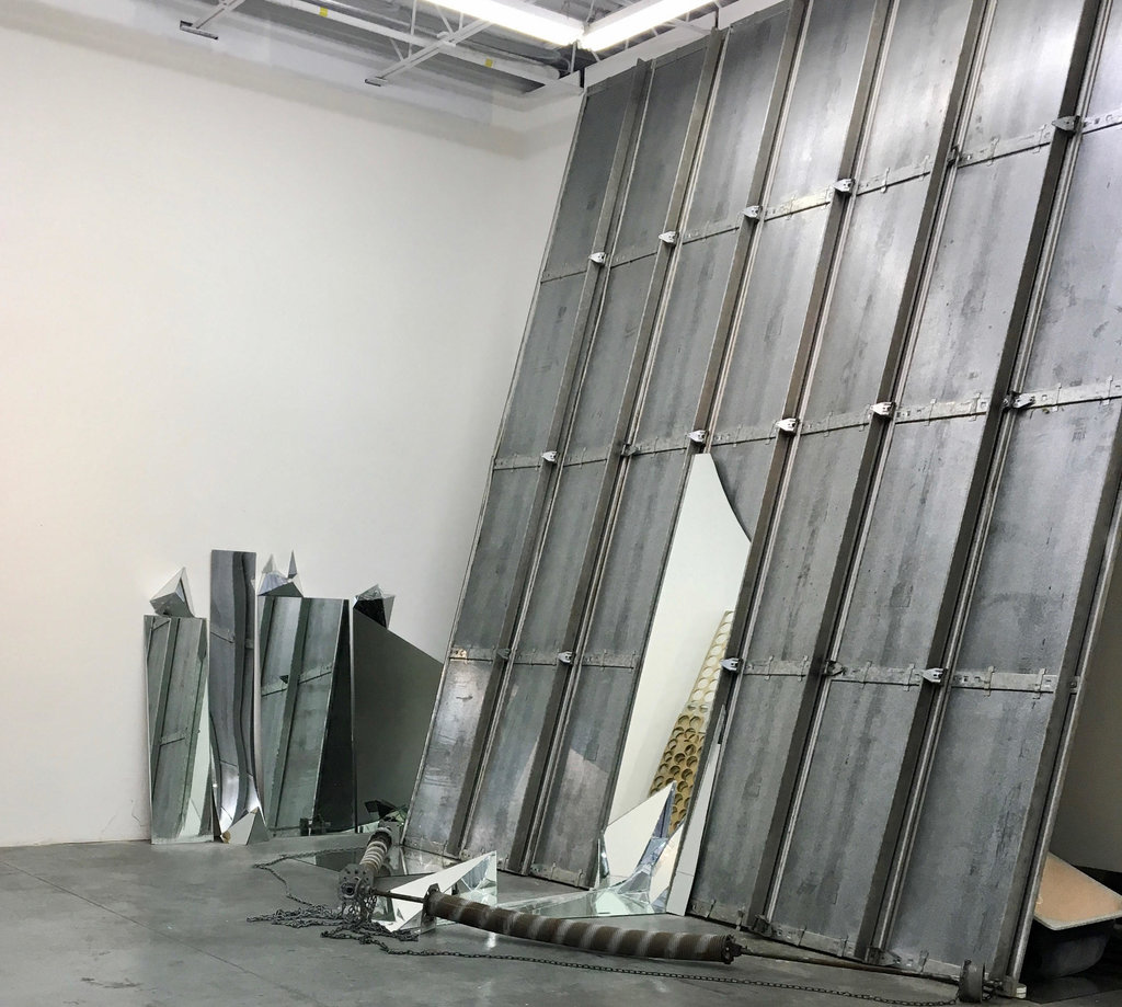 The old metal garage door stands against the back wall of the gallery, creating a neutral surface. The installation is a tribute to the old garage door’s historic size, its magnitude. A cut mirror in the middle of it opens the space giving an entrance into another world, or into ourselves if we stand right in front of it, looking at our distorted image.