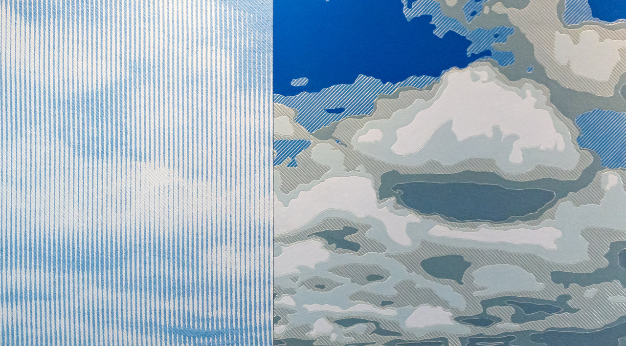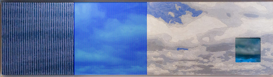 Like Tseng’s, Sandblom’s works are carefully composed of several elements. In Sandblom’s case these elements comprise machine-made tapestries and wood engravings, as well as manipulated photographic images under coloured perspex – all artfully combined. Most often there is an underlying pattern that crosses the abutting panels of tapestry and engraving which pulls the whole picture together. While the viewer easily recognises these patterns to be based on clouds and water, the original photographic imagery has been drastically pared down to its elemental forms.