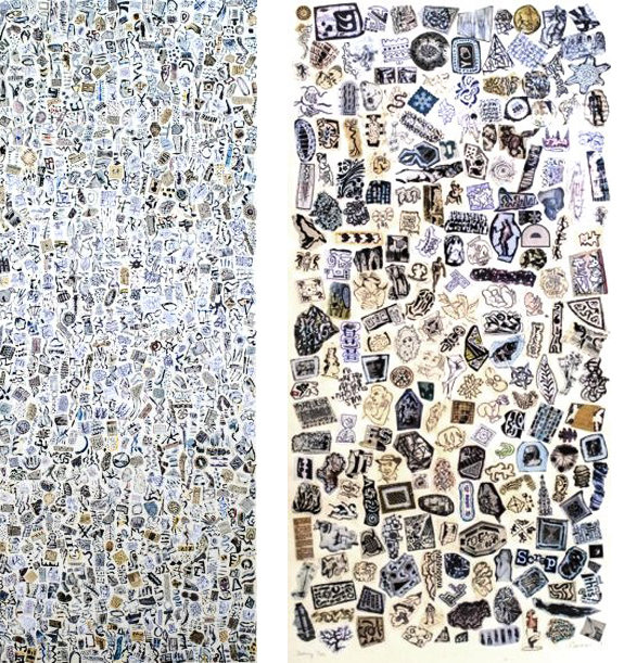 Desire Notes, 2017, acrylic/collage on canvas, 56 x 20 in (left) and