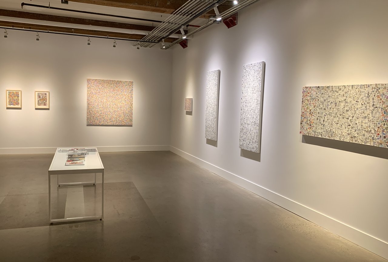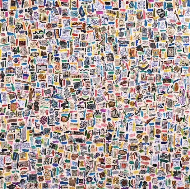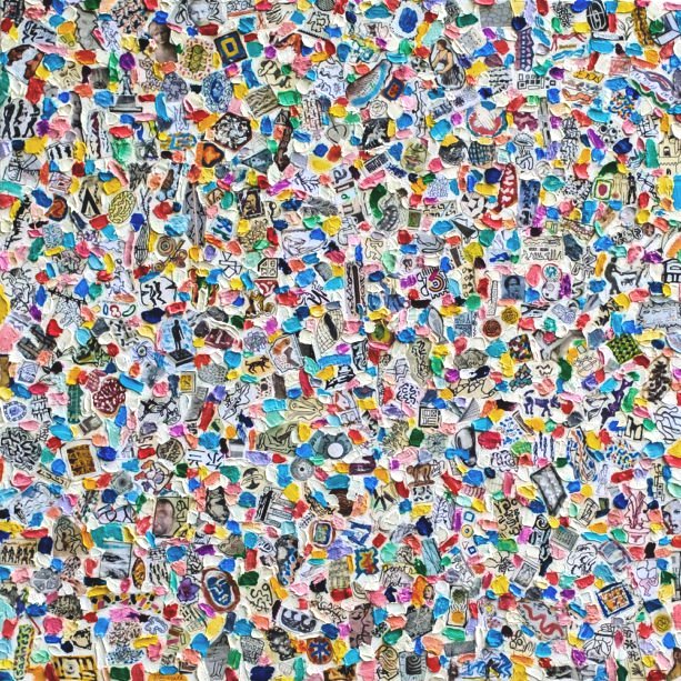 Scraps of info, 2018, oil/collage on canvas, 30 x 30 in. Courtesy of Yumart