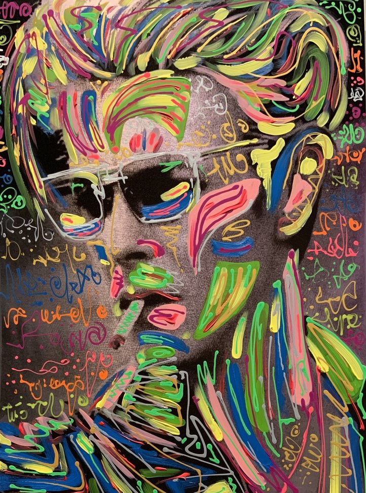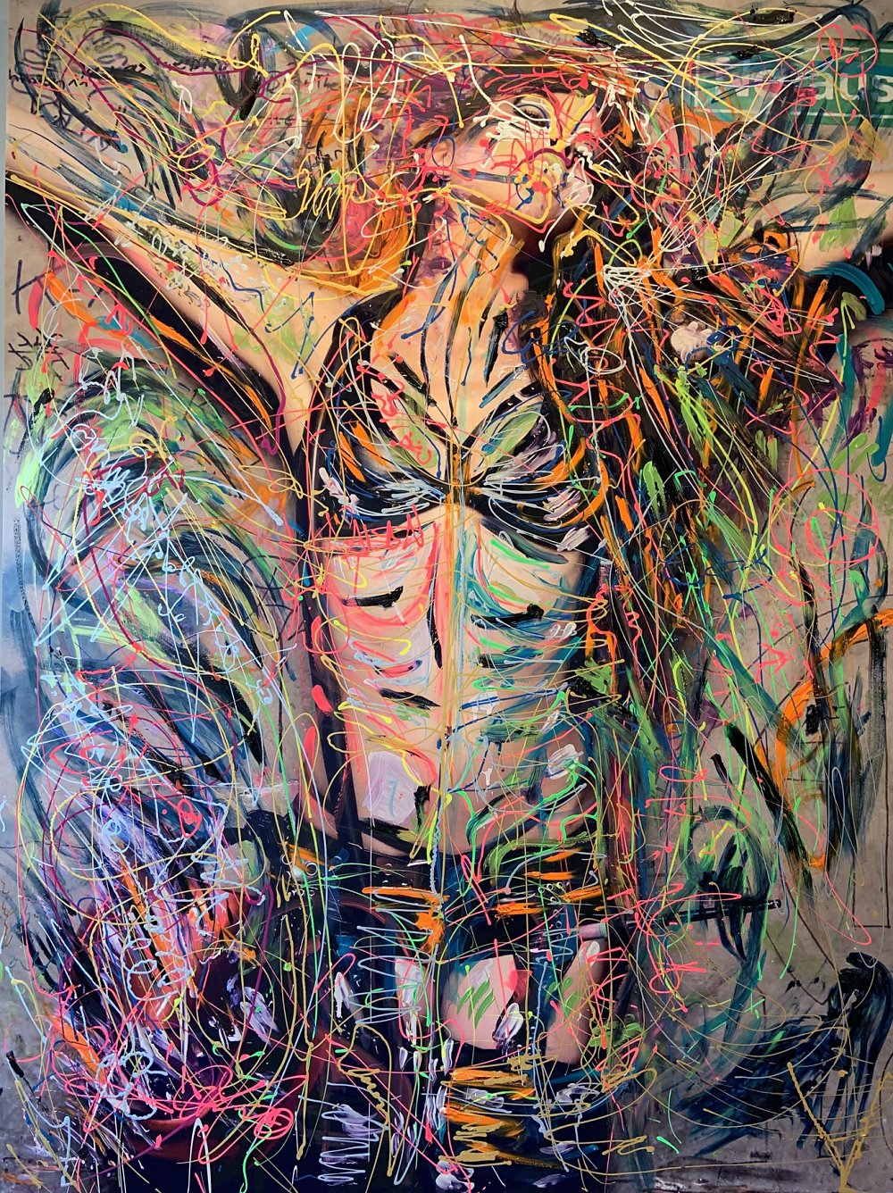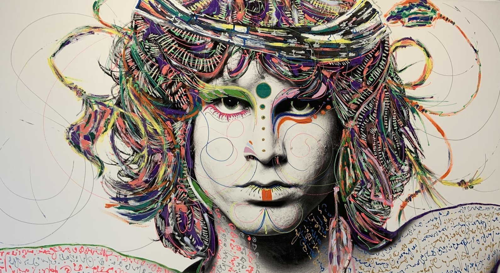 VAYA’s adaptation of Joel Brodsky’s infamous 1967 black and white photograph of Jim Morrison could be what initially draws the viewer in. The artist placed the print on canvas, and with her array of colors and lines, she masterfully decorated the iconic portrait. She applied a sort of mask to his famous face; offering a more spiritual perspective and experience of this troubled rock star.