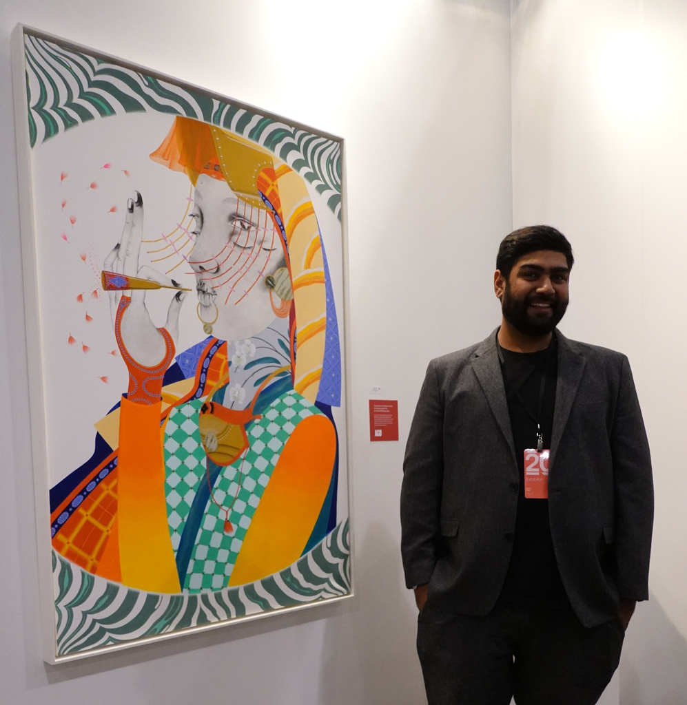 Devan Patel, owner of Patel Gallery, Toronto in front of Rajni Perera’s work, that was purchased by the AGO at the opening night