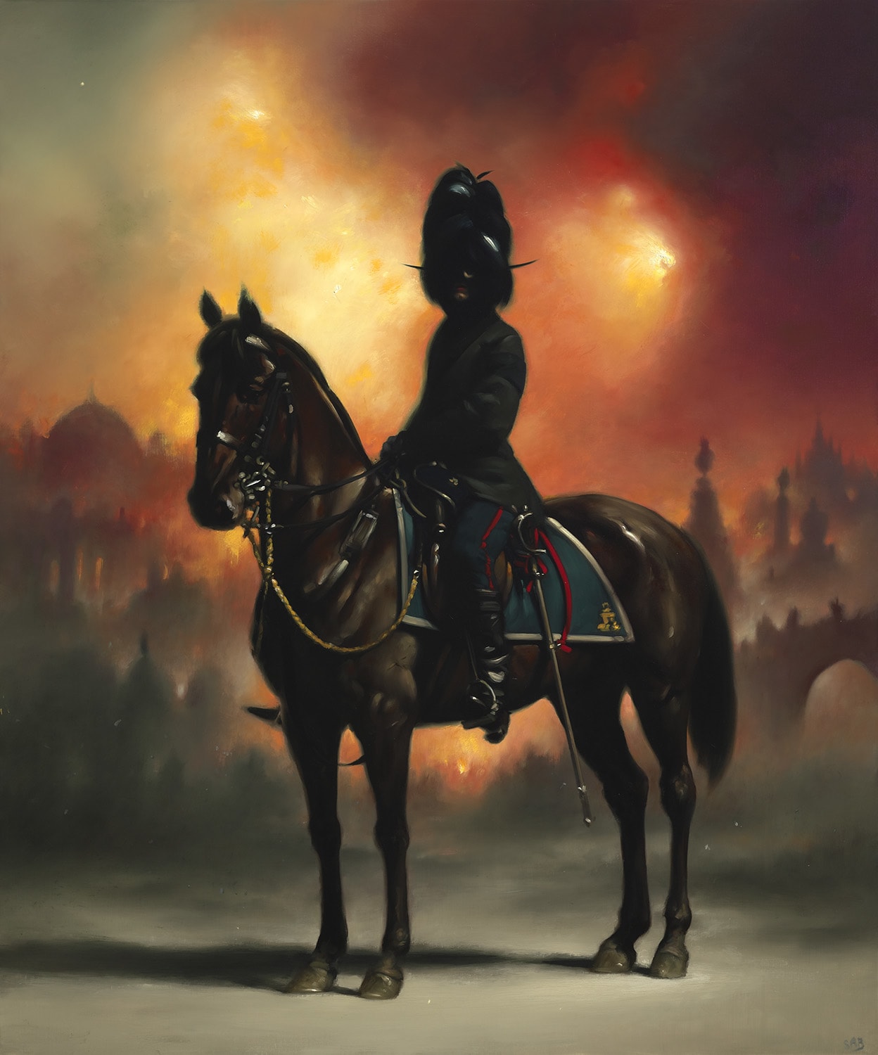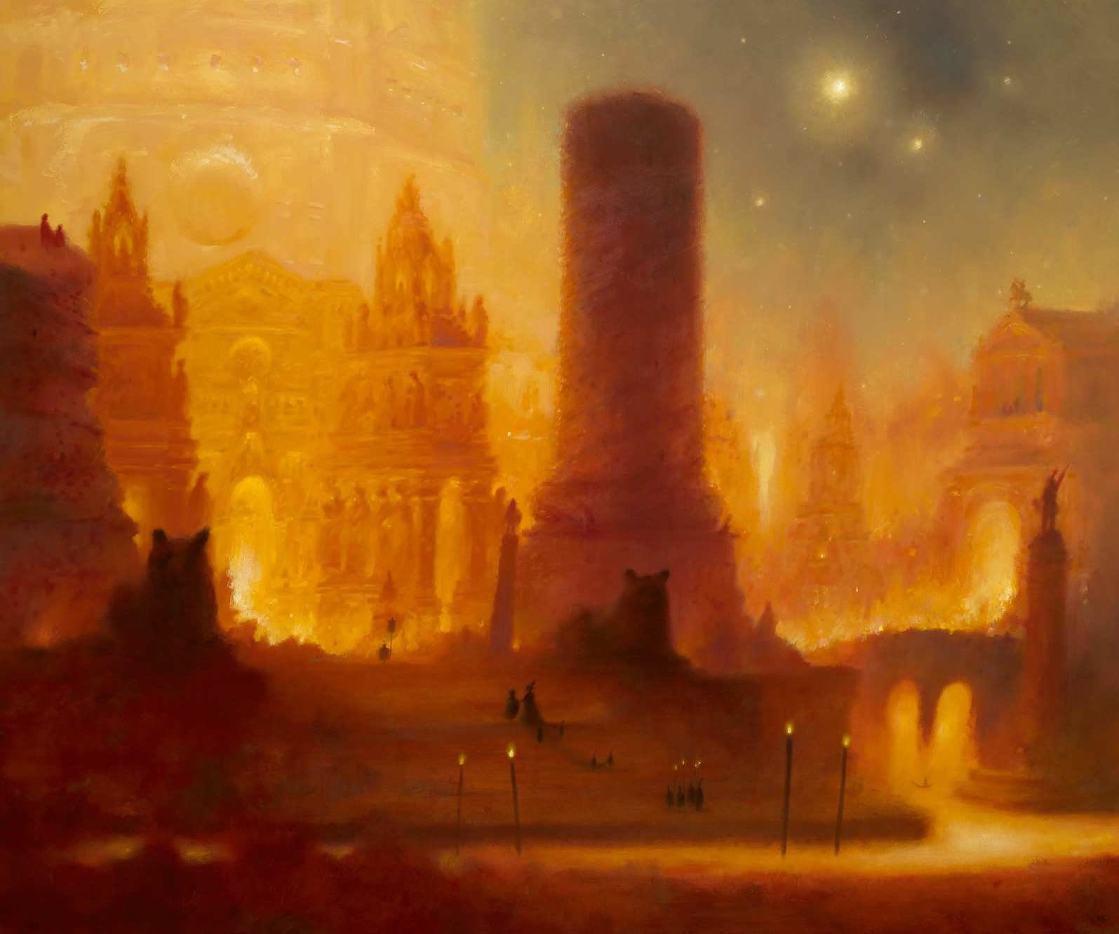 Stephen Appleby-Barr, Dark Messenger with a Burning City, 2019 oil on linen, 71 x 59 in.