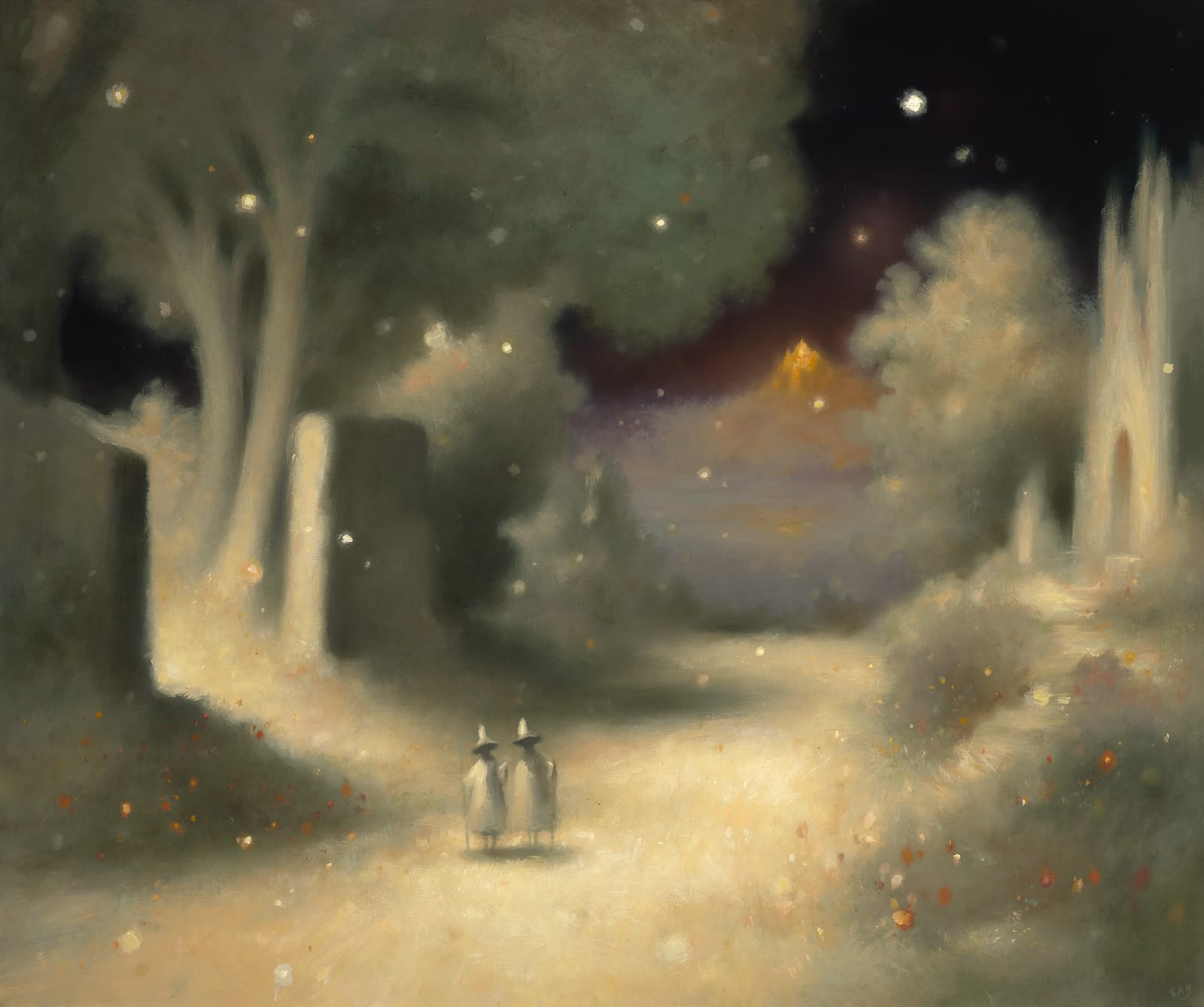 In his 2019 piece, Debating the Walker’s Wisdom, he portrays a landscape washed in white with a cascading night sky glittering with silver stars. There is something ephemeral about these pieces. They are captured moments, suspended in time that could change at any moment. The black and white cat Bumpy, could decide to get up and walk straight off the canvas, leaving the landscape blank.