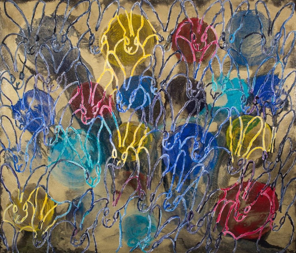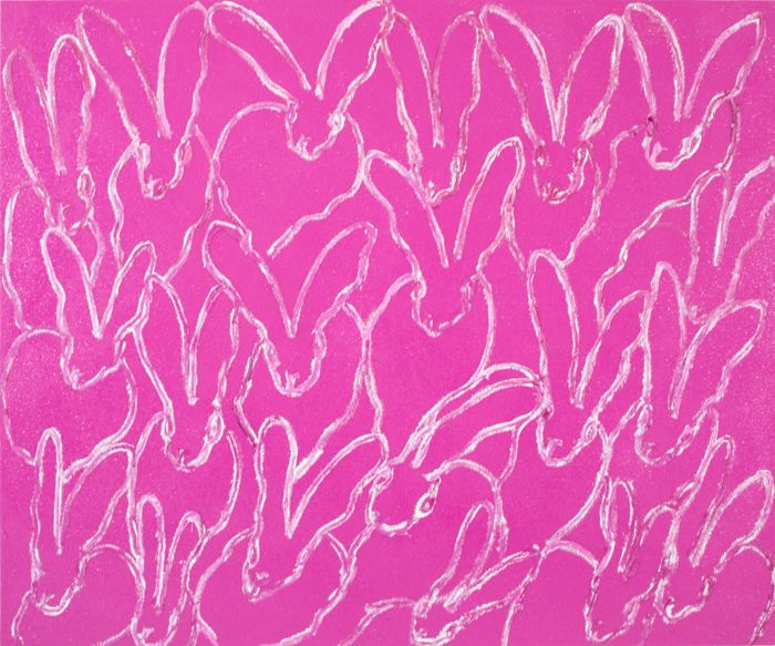 Slonem proves himself a master of texture in his paintings like Cleopatra. The composition is so heavy with paint that the outlines of the rabbits are lifted from the canvas’ surface as if having a life of their own.