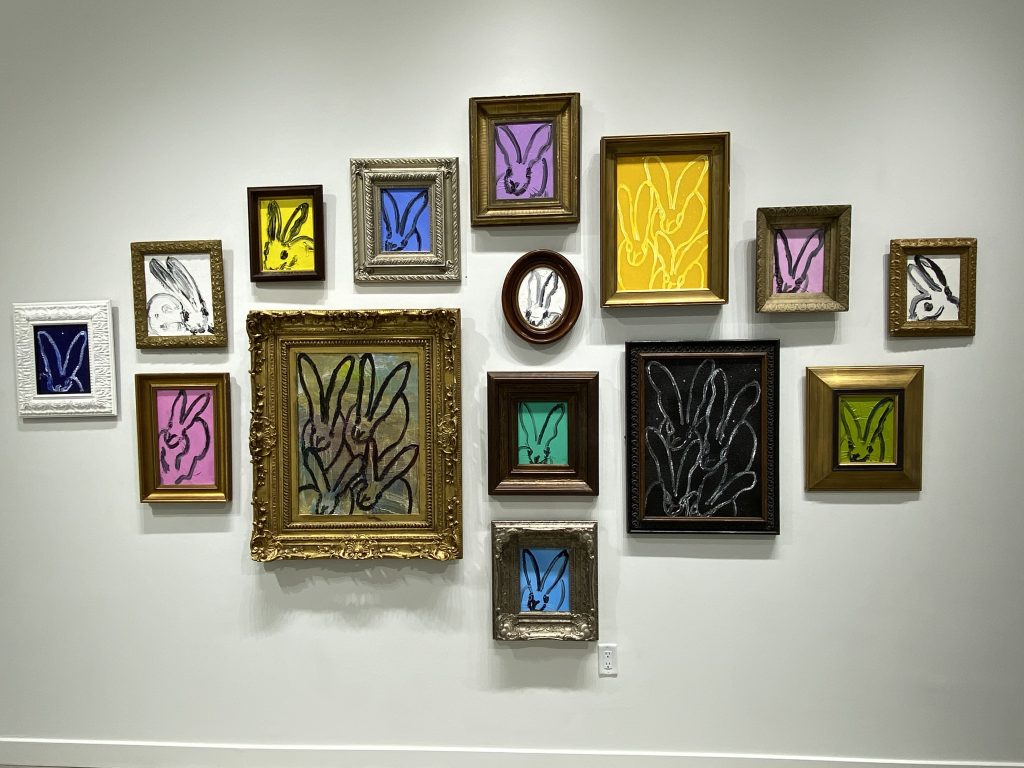 Installation view with Hunt Slonem’s Rabbit portraits, oil with diamond dust on canvas, various dimensions