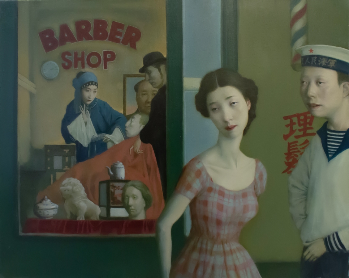 Chinese-Canadian, Jeffrey Chong Wang, draws on his culture and heritage as the inspiration for his whimsical oil paintings. The talented artist achieves a nostalgic and historical aesthetic by using portraits of family members and friends in his compositions, fusing them together with specific locations in China which he recalls from his time growing up there. In his piece Rainy Day, his trademark style is very much present, drawing on themes of communism, literature, and sensuality, with protagonists that are borrowed from Chong Wang’s own life.