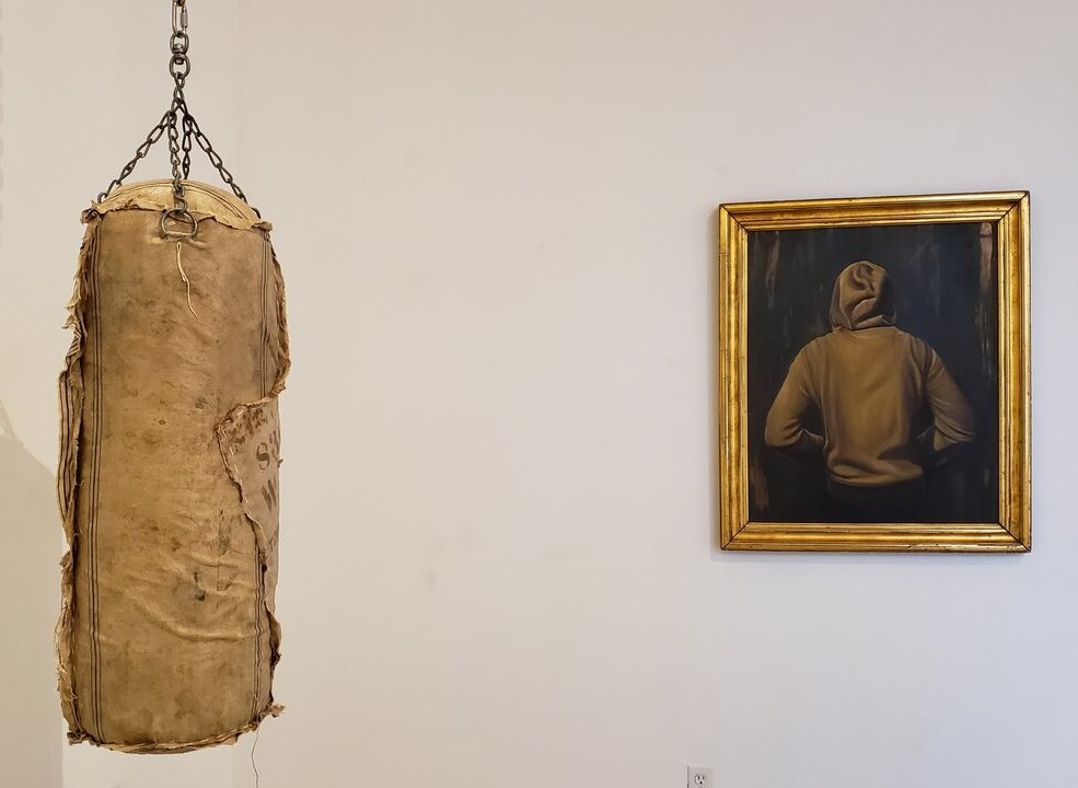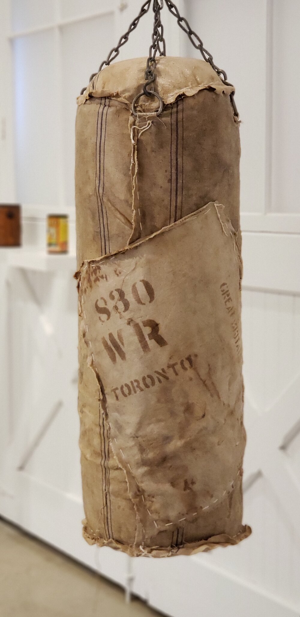 Gordon Shadrach, Contend, 2020, vintage cotton cloth farm sacks, vinyl boxing bag, steel chain, 49” x 15”