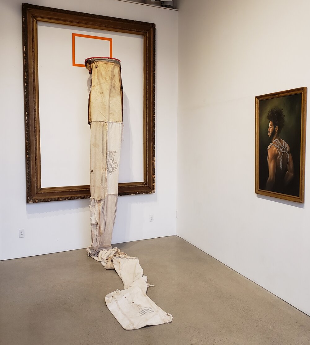 GS: Net Worth seemed like the appropriate title to me because the exhibit is about the value placed on the Black man in western society and nets obvious connection to sports. I’m drawn to titles that have multiple meanings. A net can be used to trap others, and the allure of success within the sports world is inescapable for some. How is one’s self-worth connected to their net worth?
