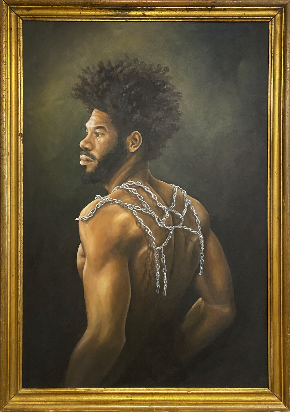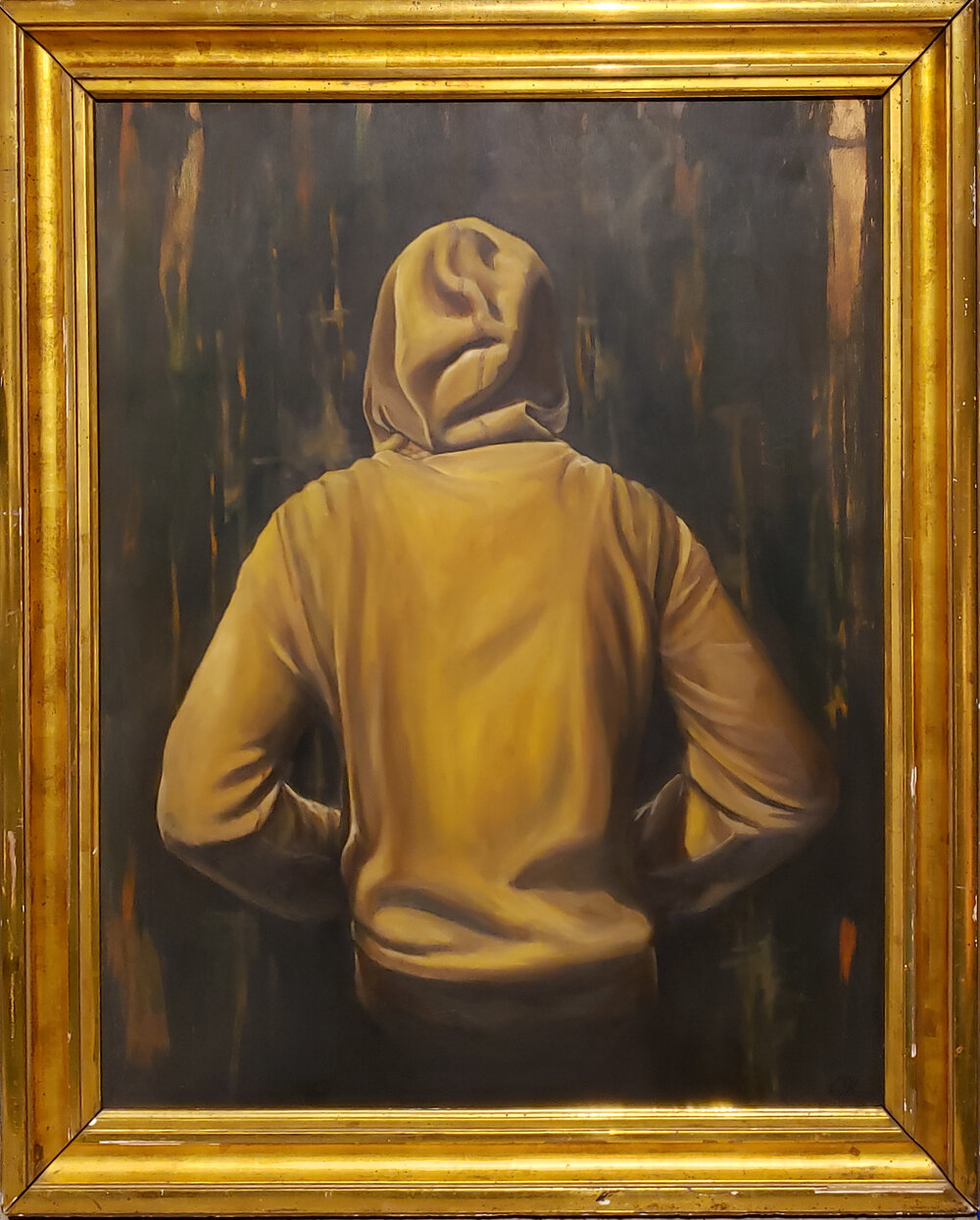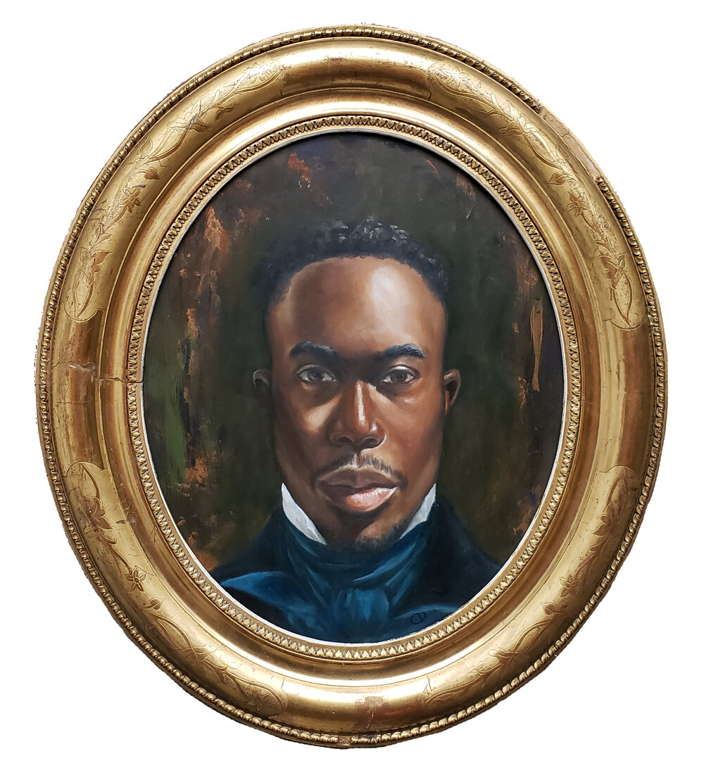 Gordon Shadrach, Net Worth, 2020, oil on birch panel, antique frame, 37.5 “ x 24.5 “