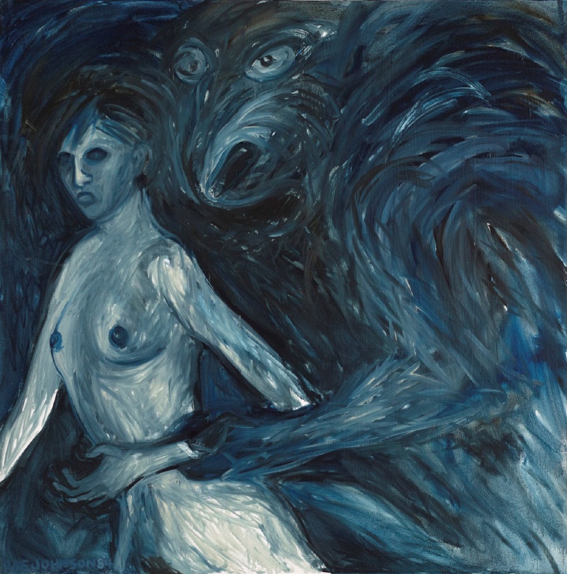The one archetype Johnson adopted above all has been that of the madonna or the female angel that represents woman as sacred. She contrasted this image with that of the profane world of the everyday. Hence we see the madonna-like figure appear in bars, e.g., in Angel in the Rivoli or at the foot of the lovers’ bed in Anima, Animus. In this latter painting, the male lover is depicted as wrapped in plastic, echoing the theme of the often unspoken violence of sexuality.