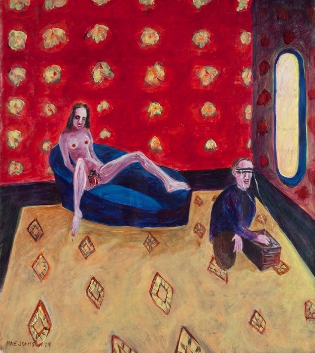 Johnson’s first sustained foray into painting was on the theme of pornography. She began producing these works while she was still a student, inspired by her time in New York city as part of OCA’s erstwhile independent study program there. She became preoccupied with pornography because of its violent debasement of women. She attacked the subject with immense energy, producing a great many studies in acrylic in a short period of time. One example is her Empire State that depicts the antagonists as alienated souls in absurd juxtaposition. As with all these works it possesses a disturbing psychological aura. And this psychological dimension soon became the overarching ethos of her work quite generally.