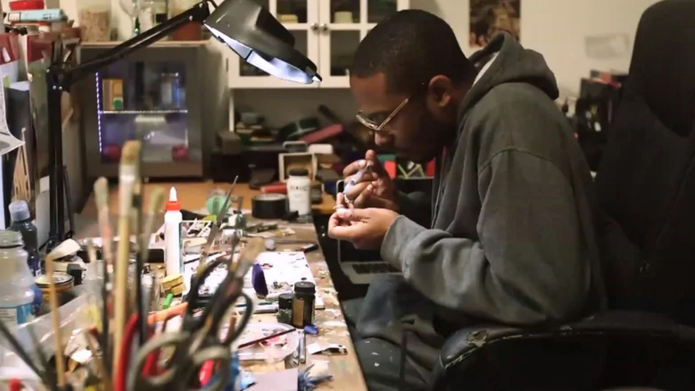 Curtis ‘Talwst’ Santiago in his studio, constructing one of his small artworks. (CBC Arts. November 4, 2015)