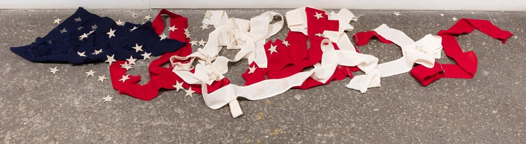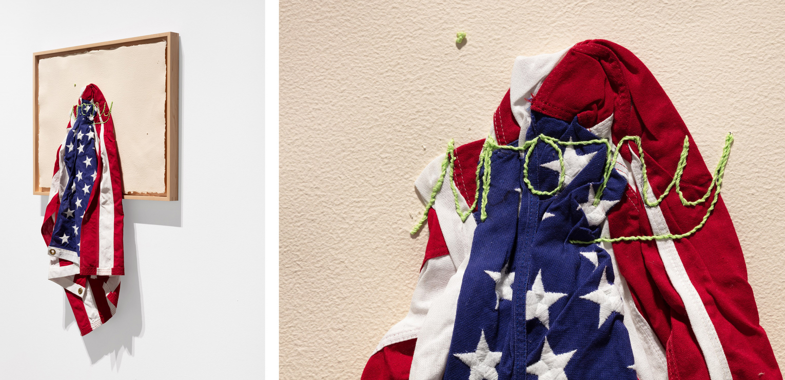 A representation of a flag lies on the gallery floor, in the form of strips of fabric: long thin white and red pieces and a square navy piece with tiny stars resting upon it. Another flag, this one more traditional and undamaged, likely an actual flag Clark has repurposed, is affixed to a blank cream-coloured canvas. The flag is bunched-up and sewn onto the canvas with bright green threads that read “irony” in cursive.