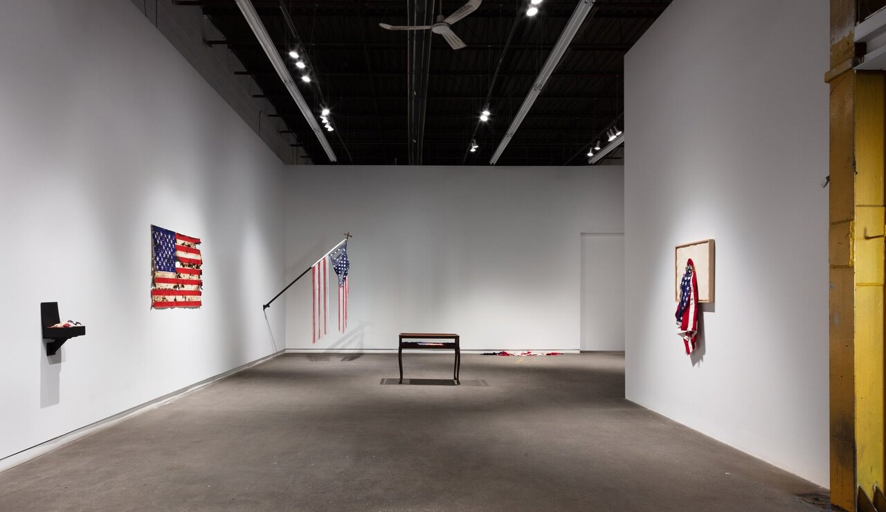 The show, though now moved online, takes place in a stark, monochrome room, with walls, floors, and a display table all sparsely occupied with different iterations of the American flag. The neutral tones and unadorned nature of the gallery space allow these works to stand out and become independent from one another.